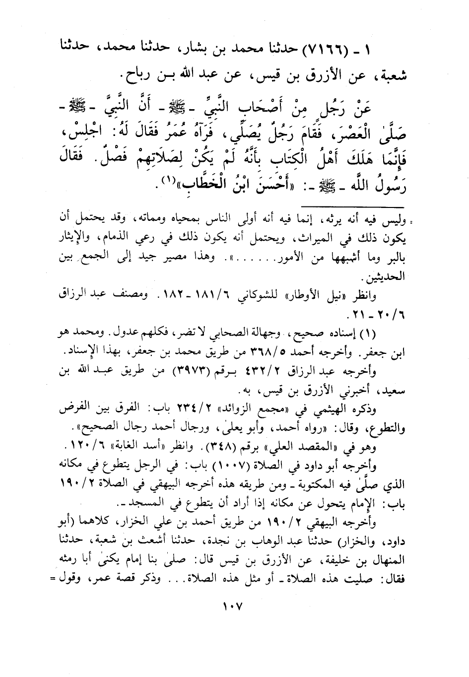 7166 - حَدَّثَنَا مُحَمَّدُ بْنُ بَشَّارٍ، حَدَّثَنَا مُحَمَّدٌ، حَدَّثَنَا شُعْبَةُ، عَنِ الْأَزْرَقِ بْنِ قَيْسٍ، عَنْ عَبْدِ اللَّهِ بْنِ رَبَاحٍ، عَنْ رَجُلٍ مِنْ أَصْحَابِ النَّبِيِّ صَلَّى اللهُ عَلَيْهِ وَسَلَّمَ، أَنَّ النَّبِيَّ صَلَّى اللهُ عَلَيْهِ وَسَلَّمَ صَلَّى الْعَصْرَ، فَقَامَ رَجُلٌ يُصَلِّي، فَرَآهُ عُمَرُ، فَقَالَ لَهُ: اجْلِسْ، فَإِنَّمَا §هَلَكَ أَهْلُ الْكِتَابِ بِأَنَّهُ لَمْ يَكُنْ لِصَلَاتِهِمْ فَصْلٌ، فَقَالَ رَسُولُ اللَّهِ صَلَّى اللهُ عَلَيْهِ وَسَلَّمَ: «أَحْسَنَ ابْنُ الْخَطَّابِ» Kإسناده صحيح