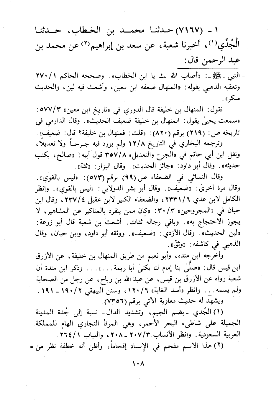 7167 - حَدَّثَنَا مُحَمَّدُ بْنُ الْخَطَّابِ، حَدَّثَنَا الْجُدِّيُّ، أَخْبَرَنَا شُعْبَةُ، عَنْ سَعْدِ بْنِ إِبْرَاهِيمَ، عَنْ مُحَمَّدِ بْنِ عَبْدِ الرَّحْمَنِ قَالَ -[109]-: سَمِعْتُ عَمِّيَ يُحَدِّثُ، عَنِ النَّبِيِّ صَلَّى اللهُ عَلَيْهِ وَسَلَّمَ قَالَ: «§مَنْ سَمِعَ النِّدَاءَ يَوْمَ الْجُمُعَةِ فَلَمْ يَأْتِ، أَوْ لَمْ يُجِبْ، ثُمَّ سَمِعَ النِّدَاءَ فَلَمْ يَأْتِ، أَوْ فَلَمْ يُجِبْ، ثُمَّ سَمِعَ النِّدَاءَ فَلَمْ يَأْتِ، أَوْ لَمْ يُجِبْ، طَبَعَ اللَّهُ عَزَّ وَجَلَّ عَلَى قَلْبِهِ، فَجُعِلَ قَلْبَ مُنَافِقٍ» Kإسناده حسن