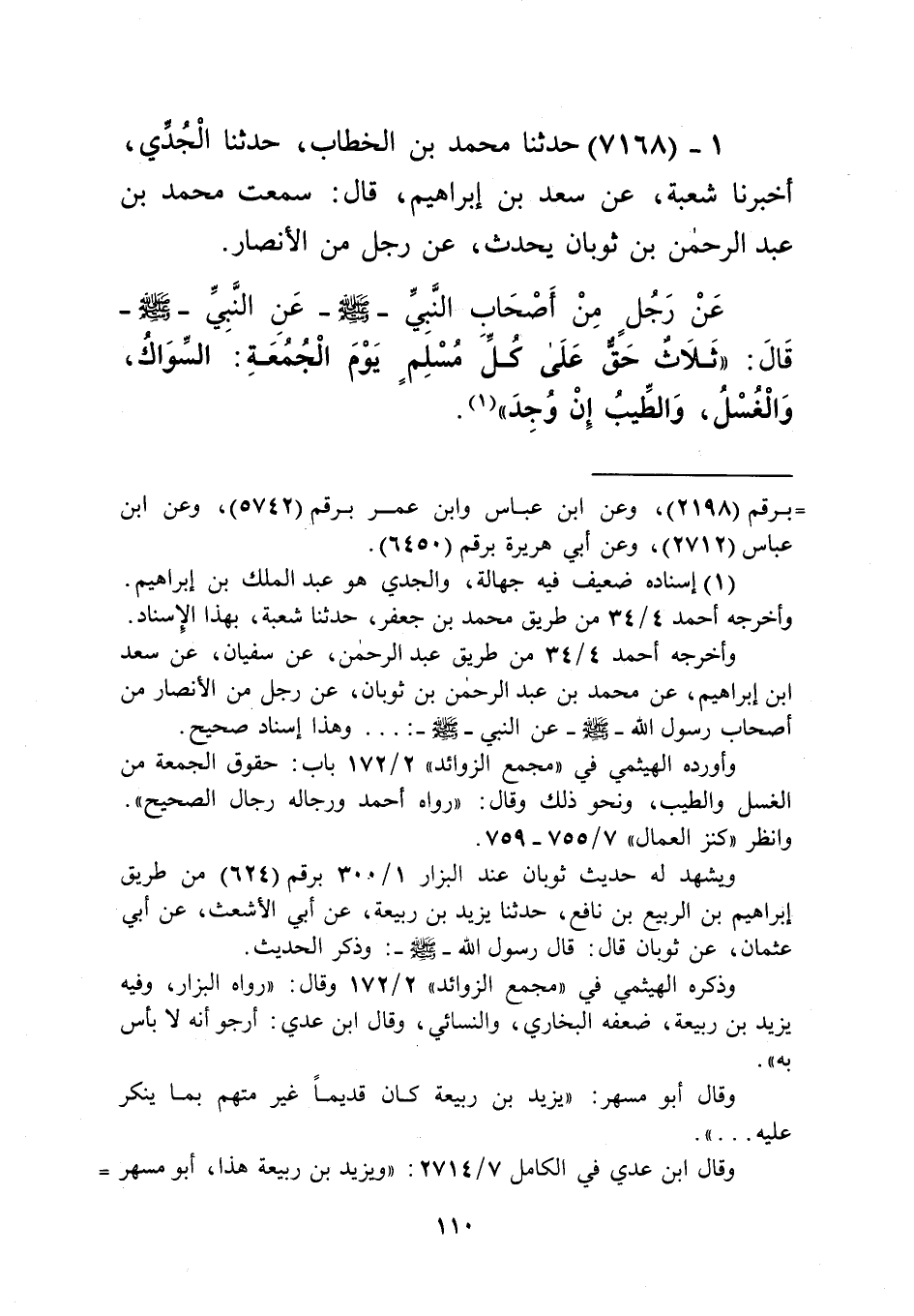 7168 - حَدَّثَنَا مُحَمَّدُ بْنُ الْخَطَّابِ، حَدَّثَنَا الْجُدِّيُّ، أَخْبَرَنَا شُعْبَةُ، عَنْ سَعْدِ بْنِ إِبْرَاهِيمَ قَالَ: سَمِعْتُ مُحَمَّدَ بْنَ عَبْدِ الرَّحْمَنِ بْنِ ثَوْبَانَ يُحَدِّثُ، عَنْ رَجُلٍ مِنَ الْأَنْصَارِ، عَنْ رَجُلٍ مِنْ أَصْحَابِ النَّبِيِّ صَلَّى اللهُ عَلَيْهِ وَسَلَّمَ، عَنِ النَّبِيِّ صَلَّى اللهُ عَلَيْهِ وَسَلَّمَ قَالَ: " §ثَلَاثٌ حَقٌّ عَلَى كُلِّ مُسْلِمٍ يَوْمَ الْجُمُعَةِ: السِّوَاكُ، وَالْغُسْلُ، وَالطِّيبُ إِنْ وُجِدَ "Kإسناده ضعيف