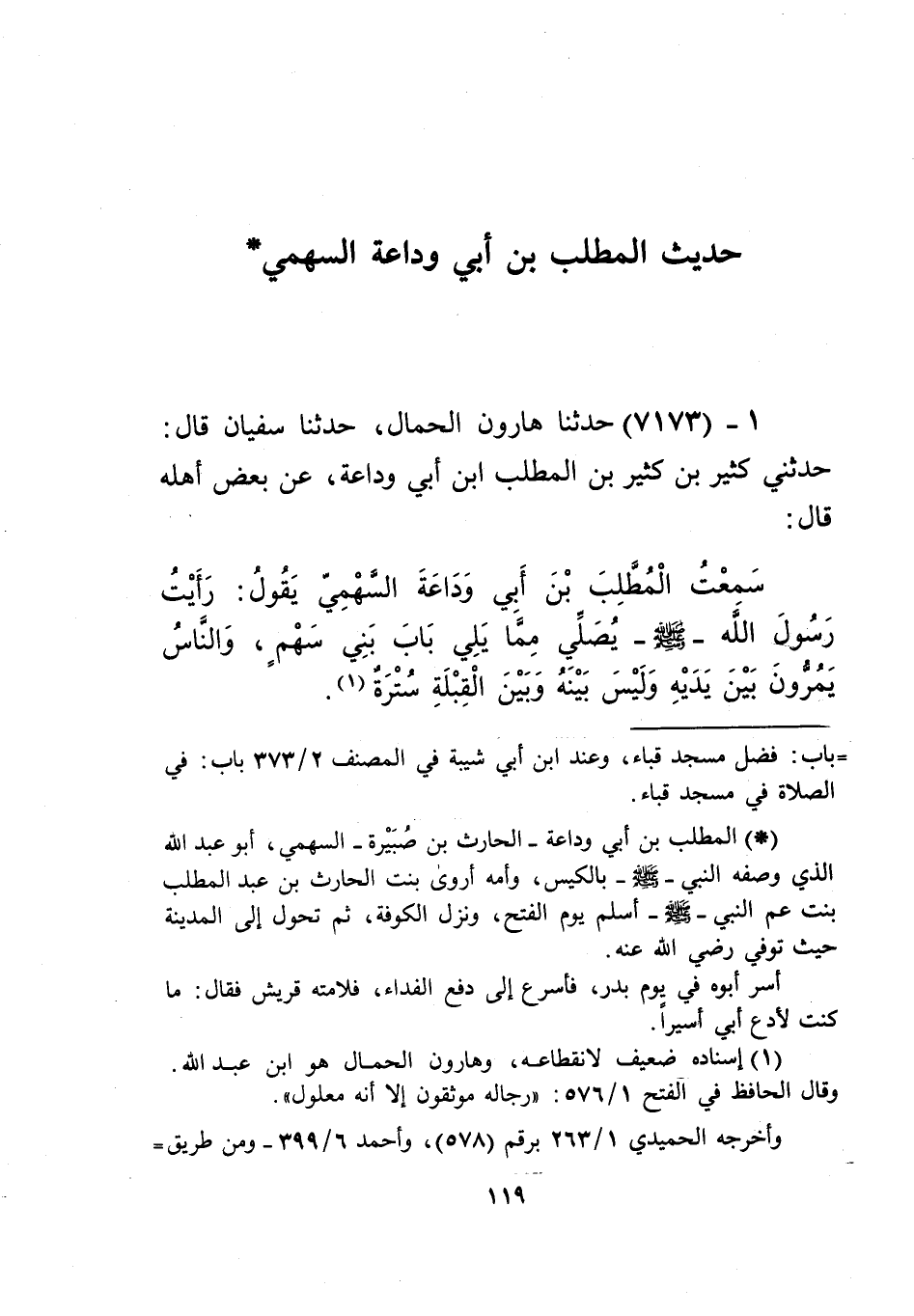 7173 - حَدَّثَنَا هَارُونُ الْحَمَّالُ، حَدَّثَنَا سُفْيَانُ، قَالَ: حَدَّثَنَا كَثِيرُ بْنُ كَثِيرِ بْنِ الْمُطَّلِبِ بْنِ أَبِي وَدَاعَةَ، عَنْ بَعْضِ أَهْلِهِ قَالَ: سَمِعْتُ الْمُطَّلِبَ بْنَ أَبِي وَدَاعَةَ السَّهْمِيَّ يَقُولُ: «رَأَيْتُ رَسُولَ اللَّهِ صَلَّى اللهُ عَلَيْهِ وَسَلَّمَ §يُصَلِّي مِمَّا يَلِي بَابَ بَنِي سَهْمٍ، وَالنَّاسُ يَمُرُّونَ بَيْنَ يَدَيْهِ، وَلَيْسَ بَيْنَهُ وَبَيْنَ الْقِبْلَةِ سُتْرَةٌ» Kإسناده ضعيف
