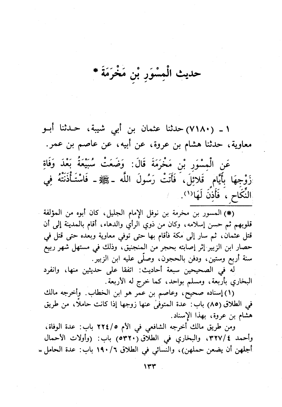 7180 - حَدَّثَنَا عُثْمَانُ بْنُ أَبِي شَيْبَةَ، حَدَّثَنَا أَبُو مُعَاوِيَةَ، حَدَّثَنَا هِشَامُ بْنُ عُرْوَةَ، عَنْ أَبِيهِ، عَنْ عَاصِمِ بْنِ عُمَرَ، عَنِ الْمِسْوَرِ بْنِ مَخْرَمَةَ قَالَ: «وَضَعَتْ سُبَيْعَةُ بَعْدَ وَفَاةِ زَوْجِهَا بِأَيَّامٍ قَلَائِلَ، §فَأَتَتْ رَسُولَ اللَّهِ صَلَّى اللهُ عَلَيْهِ وَسَلَّمَ، فَاسْتَأْذَنَتْهُ فِي النِّكَاحِ، فَأَذِنَ لَهَا» Kإسناده صحيح