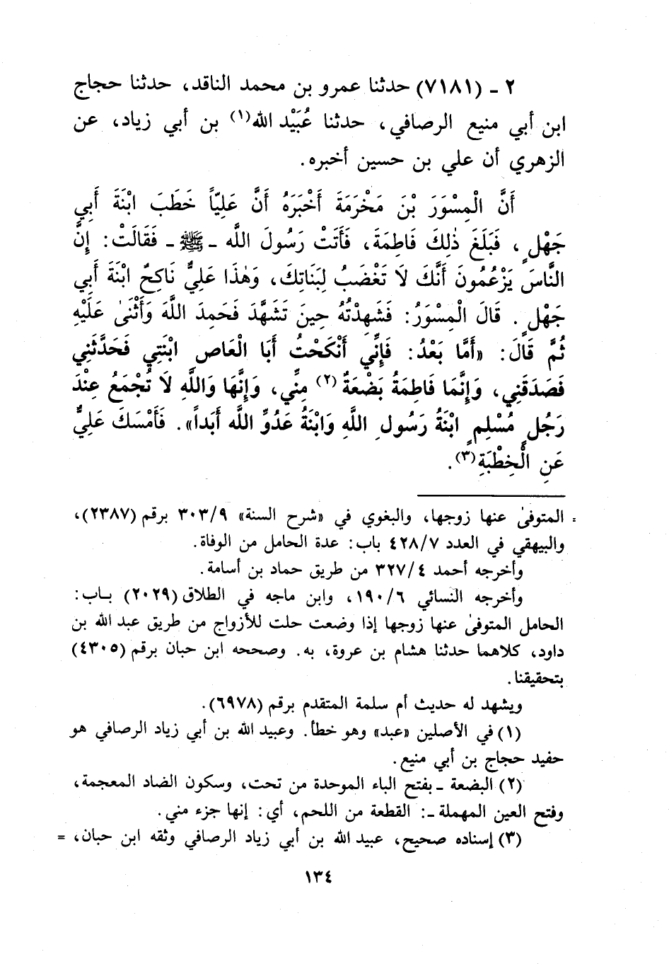 7181 - حَدَّثَنَا عَمْرُو بْنُ مُحَمَّدٍ النَّاقِدُ، حَدَّثَنَا حَجَّاجُ بْنُ أَبِي مَنِيعٍ الرُّصَافِيُّ، حَدَّثَنَا عُبَيْدُ اللَّهِ بْنُ أَبِي زِيَادٍ، عَنِ الزُّهْرِيِّ، أَنَّ عَلِيَّ بْنَ حُسَيْنٍ أَخْبَرَهُ، أَنَّ الْمِسْوَرَ بْنَ مَخْرَمَةَ أَخْبَرَهُ، أَنَّ عَلِيًّا خَطَبَ ابْنَةَ أَبِي جَهْلٍ، فَبَلَغَ ذَلِكَ فَاطِمَةَ فَأَتَتْ رَسُولَ اللَّهِ صَلَّى اللهُ عَلَيْهِ وَسَلَّمَ، فَقَالَتْ: إِنَّ النَّاسَ يَزْعُمُونَ أَنَّكَ لَا تَغْضَبُ لِبَنَاتِكَ، وَهَذَا عَلِيٌّ نَاكِحٌ ابْنَةَ أَبِي جَهْلٍ، قَالَ الْمِسْوَرُ: فَشَهِدْتُهُ حِينَ تَشَهَّدَ، فَحَمِدَ اللَّهَ , وَأَثْنَى عَلَيْهِ، ثُمَّ قَالَ: " أَمَّا بَعْدُ: §فَإِنِّي أَنْكَحْتُ أَبَا الْعَاصِ ابْنَتِي , فَحَدَّثَنِي فَصَدَقَنِي، وَإِنَّمَا فَاطِمَةُ بَضْعَةٌ مِنِّي، وَإِنَّهَا وَاللَّهِ لَا تُجْمَعُ عِنْدَ رَجُلٍ مُسْلِمٍ ابْنَةُ رَسُولِ اللَّهِ , وَابْنَةُ عَدُوِّ اللَّهِ أَبَدًا "، فَأَمْسَكَ عَلِيٌّ عَنِ الْخِطْبَةِKإسناده صحيح