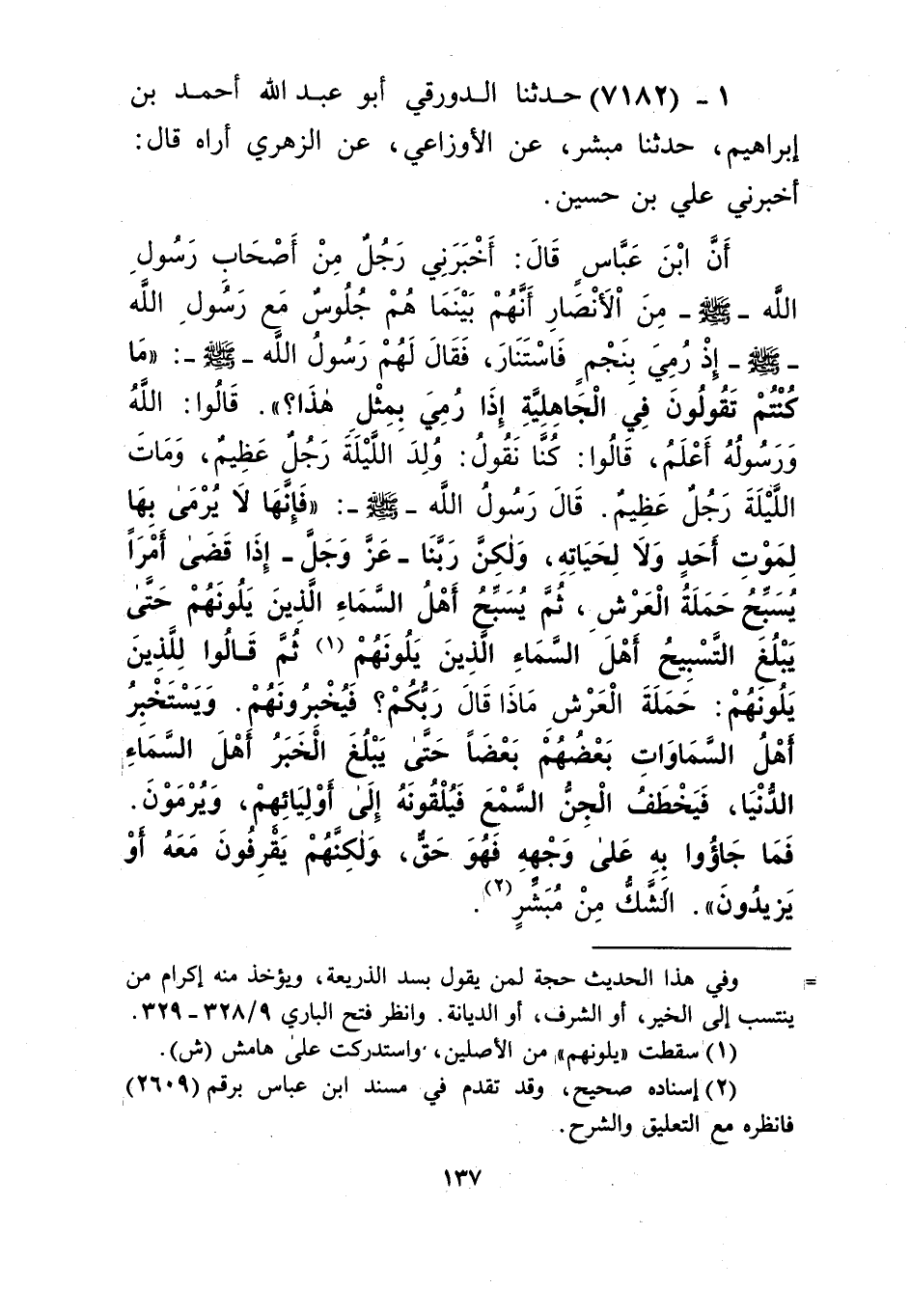 7182 - حَدَّثَنَا الدَّوْرَقِيُّ أَبُو عَبْدِ اللَّهِ أَحْمَدُ بْنُ إِبْرَاهِيمَ، حَدَّثَنَا مُبَشِّرٌ، عَنِ الْأَوْزَاعِيِّ، عَنِ الزُّهْرِيِّ، أُرَاهُ قَالَ: أَخْبَرَنِي عَلِيُّ بْنُ حُسَيْنٍ، أَنَّ ابْنَ عَبَّاسٍ قَالَ: أَخْبَرَنِي رَجُلٌ مِنْ أَصْحَابِ رَسُولِ اللَّهِ صَلَّى اللهُ عَلَيْهِ وَسَلَّمَ مِنَ الْأَنْصَارِ، أَنَّهُمْ بَيْنَمَا هُمْ جُلُوسٌ مَعَ رَسُولِ اللَّهِ صَلَّى اللهُ عَلَيْهِ وَسَلَّمَ إِذْ رُمِيَ بِنَجْمٍ فَاسْتَنَارَ، فَقَالَ لَهُمْ رَسُولُ اللَّهِ صَلَّى اللهُ عَلَيْهِ وَسَلَّمَ: «مَا كُنْتُمْ تَقُولُونَ فِي الْجَاهِلِيَّةِ إِذَا رُمِيَ بِمِثْلِ هَذَا؟»، قَالُوا: اللَّهُ وَرَسُولُهُ أَعْلَمُ، قَالُوا: كُنَّا نَقُولُ: وُلِدَ اللَّيْلَةَ رَجُلٌ عَظِيمٌ، وَمَاتَ اللَّيْلَةَ رَجُلٌ عَظِيمٌ، قَالَ رَسُولُ اللَّهِ صَلَّى اللهُ عَلَيْهِ وَسَلَّمَ: " فَإِنَّهَا §لَا يُرْمَى بِهَا لِمَوْتِ أَحَدٍ , وَلَا لِحَيَاتِهِ، وَلَكِنَّ رَبَّنَا عَزَّ وَجَلَّ إِذَا قَضَى أَمْرًا يُسَبِّحُ حَمَلَةُ الْعَرْشِ، ثُمَّ يُسَبِّحُ أَهْلُ السَّمَاءِ الَّذِينَ يَلُونَهُمْ، حَتَّى يَبْلُغَ التَّسْبِيحُ أَهْلَ السَّمَاءِ الَّذِينَ يَلُونَهُمْ، ثُمَّ قَالُوا لِلَّذِينَ يَلُونَهُمْ - حَمَلَةُ الْعَرْشِ -: مَاذَا قَالَ رَبُّكُمْ؟ فَيُخْبِرُونَهُمْ وَيَسْتَخْبِرُ أَهْلُ السَّمَاوَاتِ بَعْضُهُمْ بَعْضًا حَتَّى يَبْلُغَ الْخَبَرُ أَهْلَ السَّمَاءِ الدُّنْيَا، فَيَخْطَفُ الْجِنُّ السَّمْعَ، فَيُلْقُونَهُ إِلَى أَوْلِيَائِهِمْ، وَيُرْمَوْنَ، فَمَا جَاءُوا بِهِ عَلَى وَجْهِهِ فَهُوَ حَقٌّ، وَلَكِنَّهُمْ يَقْرِفُونَ مَعَهُ، أَوْ يَزِيدُونَ "، الشَّكُّ مِنْ مُبَشِّرٍKإسناده صحيح