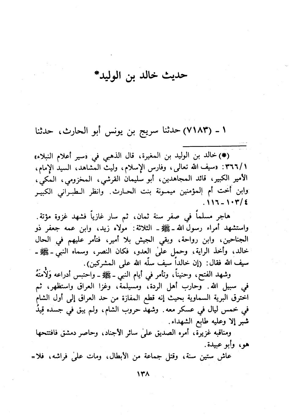 7183 - حَدَّثَنَا سُرَيْجُ بْنُ يُونُسَ أَبُو الْحَارِثِ، حَدَّثَنَا هُشَيْمٌ، عَنْ عَبْدِ الْحَمِيدِ بْنِ جَعْفَرٍ، عَنْ أَبِيهِ قَالَ: قَالَ خَالِدُ بْنُ الْوَلِيدِ: «§اعْتَمَرْنَا مَعَ النَّبِيِّ صَلَّى اللهُ عَلَيْهِ وَسَلَّمَ فِي عُمْرَةٍ اعْتَمَرَهَا، فَحَلَقَ شَعَرَهُ، فَاسْتَبَقَ النَّاسُ إِلَى شَعَرِهِ، فَسَبَقْتُ إِلَى النَّاصِيَةِ فَأَخَذْتُهَا، فَاتَّخَذْتُ قَلَنْسُوَةً فَجَعَلْتُهَا فِي مُقَدِّمَةِ الْقَلَنْسُوَةِ، فَمَا وُجِّهْتُ فِي وَجْهٍ إِلَّا فُتِحَ لِي» Kرجاله ثقات غير أنه منقطع