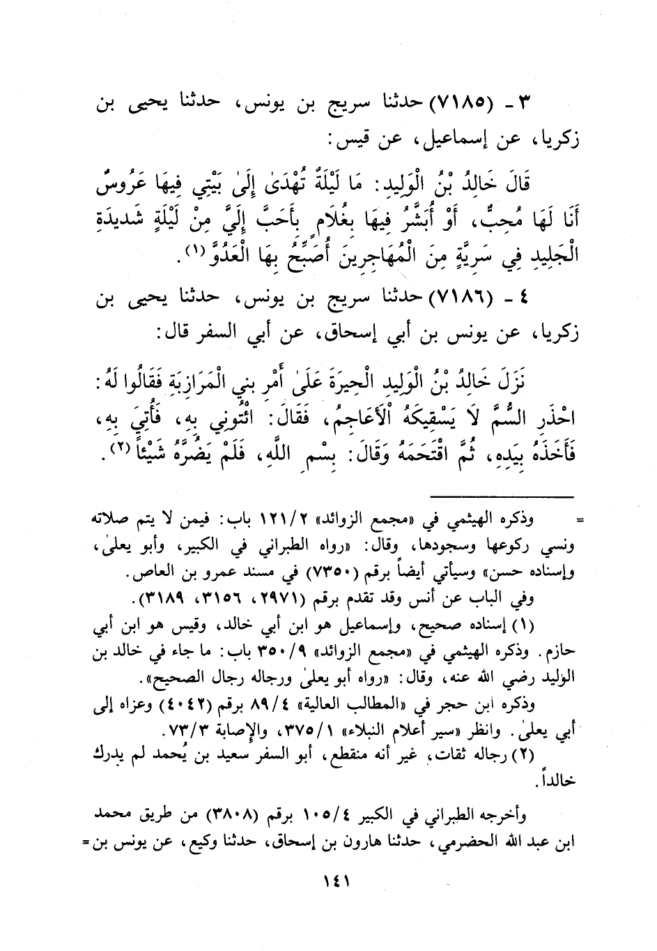 7186 - حَدَّثَنَا سُرَيْجُ بْنُ يُونُسَ، حَدَّثَنَا يَحْيَى بْنُ زَكَرِيَّا، عَنْ يُونُسَ بْنِ أَبِي إِسْحَاقَ، عَنْ أَبِي السَّفَرِ قَالَ: نَزَلَ خَالِدُ بْنُ الْوَلِيدِ الْحِيرَةَ عَلَى أَمْرِ بَنِي الْمَرَازِبَةِ، فَقَالُوا لَهُ: §احْذَرِ السُّمَّ، لَا يَسْقِيكَهُ الْأَعَاجِمُ، فَقَالَ: «ائْتُونِي بِهِ»، فَأُتِيَ بِهِ، فَأَخَذَهُ بِيَدِهِ , ثُمَّ اقْتَحَمَهُ، وَقَالَ: «بِسْمِ اللَّهِ»، فَلَمْ يَضُرَّهُ شَيْئًاKرجاله ثقات غير أنه منقطع