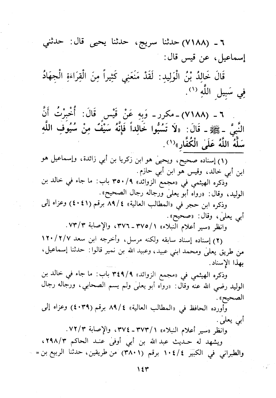 7188 - حَدَّثَنَا سُرَيْجٌ، حَدَّثَنَا يَحْيَى، قَالَ: حَدَّثَنِي إِسْمَاعِيلُ، عَنْ قَيْسٍ قَالَ: قَالَ خَالِدُ بْنُ الْوَلِيدِ: «لَقَدْ §مَنَعَنِي كَثِيرًا مِنَ الْقِرَاءَةِ الْجِهَادُ فِي سَبِيلِ اللَّهِ» Kإسناده صحيح