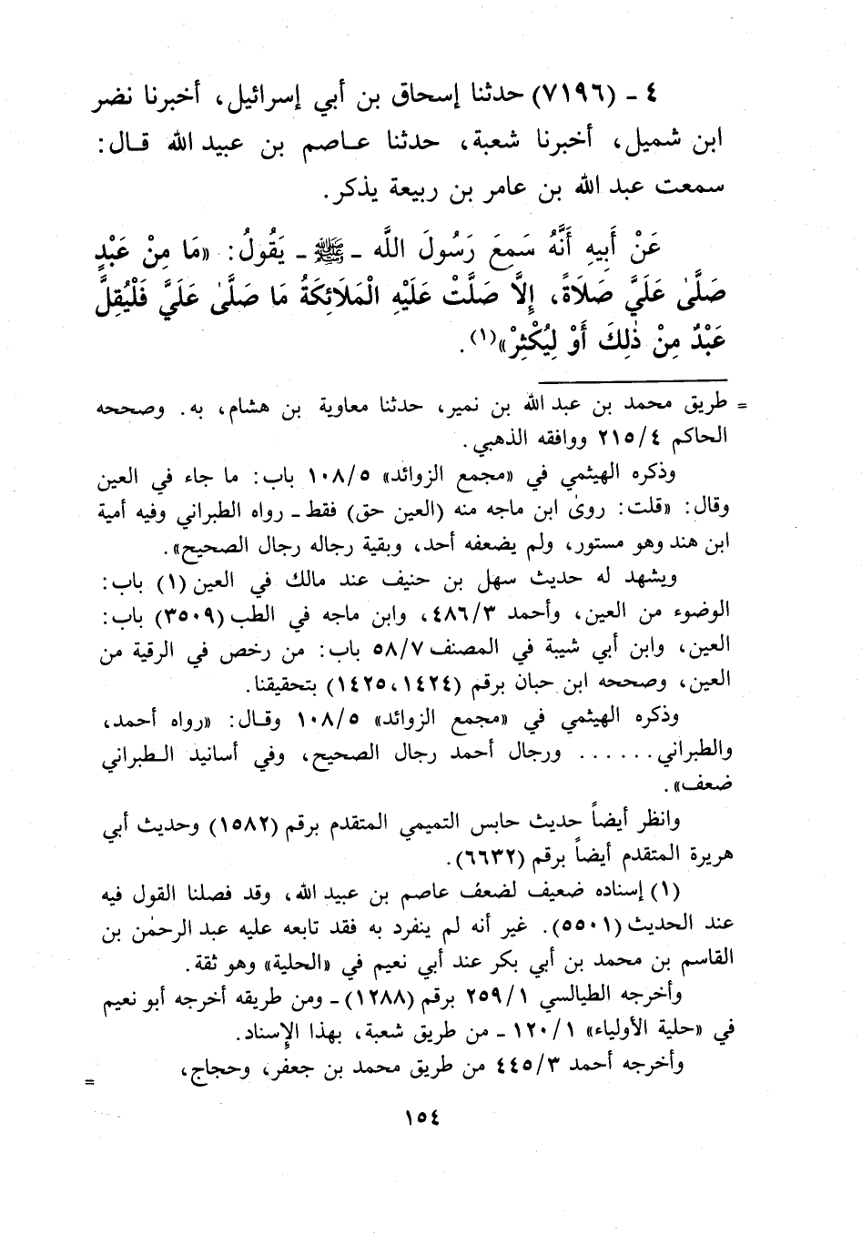 7196 - حَدَّثَنَا إِسْحَاقُ بْنُ أَبِي إِسْرَائِيلَ، أَخْبَرَنَا نَضْرُ بْنُ شُمَيْلٍ، أَخْبَرَنَا شُعْبَةُ، حَدَّثَنَا عَاصِمُ بْنُ عُبَيْدِ اللَّهِ، قَالَ: سَمِعْتُ عَبْدَ اللَّهِ بْنَ عَامِرِ بْنِ رَبِيعَةَ يَذْكُرُ، عَنْ أَبِيهِ، أَنَّهُ سَمِعَ رَسُولَ اللَّهِ صَلَّى اللهُ عَلَيْهِ وَسَلَّمَ يَقُولُ: «§مَا مِنْ عَبْدٍ صَلَّى عَلَيَّ صَلَاةً إِلَّا صَلَّتْ عَلَيْهِ الْمَلَائِكَةُ مَا صَلَّى عَلَيَّ، فَلْيُقِلَّ عَبْدٌ مِنْ ذَلِكَ , أَوْ لِيُكْثِرْ» Kإسناده ضعيف