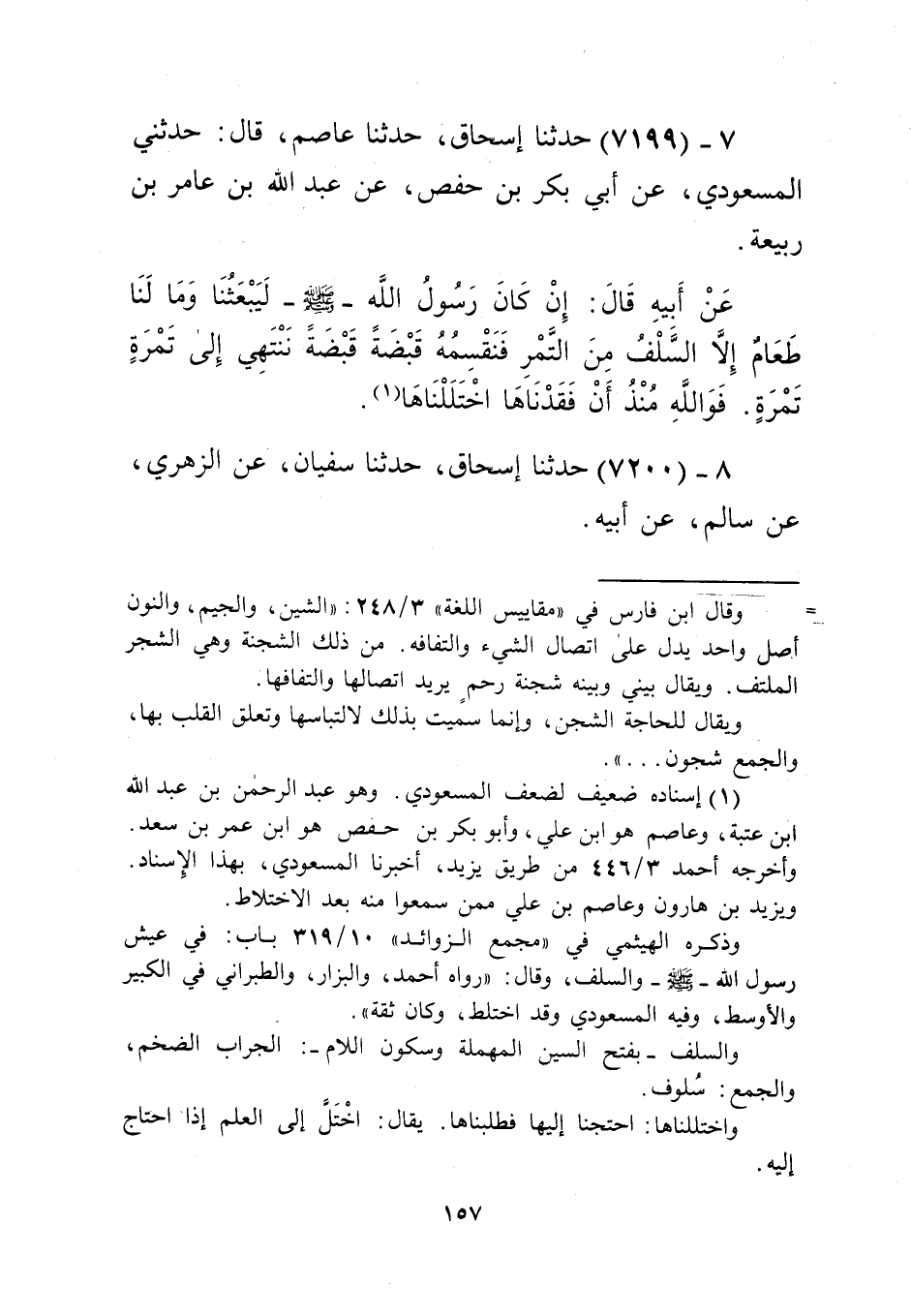 7199 - حَدَّثَنَا إِسْحَاقُ، حَدَّثَنَا عَاصِمٌ، قَالَ: حَدَّثَنِي الْمَسْعُودِيُّ، عَنْ أَبِي بَكْرِ بْنِ حَفْصٍ، عَنْ عَبْدِ اللَّهِ بْنِ عَامِرِ بْنِ رَبِيعَةَ، عَنْ أَبِيهِ قَالَ: «إِنْ كَانَ رَسُولُ اللَّهِ صَلَّى اللهُ عَلَيْهِ وَسَلَّمَ §لَيَبْعَثُنَا وَمَا لَنَا طَعَامٌ إِلَّا السَّلْفُ مِنَ التَّمْرِ، فَنُقَسِّمُهُ قَبْضَةً قَبْضَةً , نَنْتَهِي إِلَى تَمْرَةٍ تَمْرَةٍ، فَوَاللَّهِ مُنْذُ أَنْ فَقَدْنَاهَا اخْتَلَلْنَاهَا» Kإسناده ضعيف