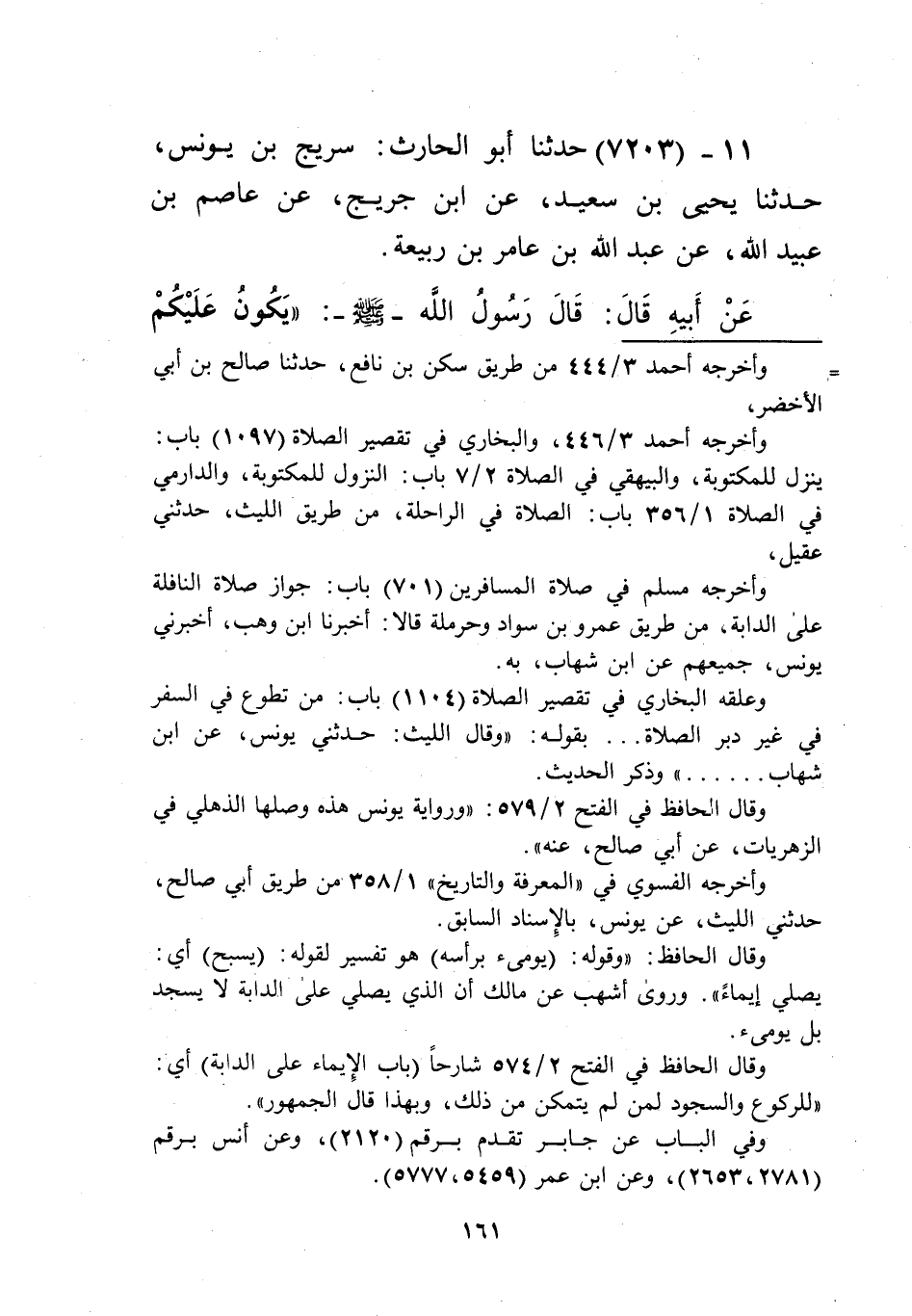 7203 - حَدَّثَنَا أَبُو الْحَارِثِ سُرَيْجُ بْنُ يُونُسَ، حَدَّثَنَا يَحْيَى بْنُ سَعِيدٍ، عَنِ ابْنِ جُرَيْجٍ، عَنْ عَاصِمِ بْنِ عُبَيْدِ اللَّهِ، عَنْ عَبْدِ اللَّهِ بْنِ عَامِرِ بْنِ رَبِيعَةَ، عَنْ أَبِيهِ قَالَ: قَالَ رَسُولُ اللَّهِ صَلَّى اللهُ عَلَيْهِ وَسَلَّمَ: «§يَكُونُ عَلَيْكُمْ أُمَرَاءُ يُصَلُّونَ الصَّلَاةَ لِوَقْتِهَا , وَيُؤَخِّرُونَ عَنْ وَقْتِهَا، فَمَا صَلُّوهَا لِوَقْتِهَا وَصَلَّيْتُمُوهَا مَعَهُمْ فَلَكُمْ وَلَهُمْ، وَمَا أَخَّرُوهَا عَنْ وَقْتِهَا , فَصَلَّيْتُمُوهَا مَعَهُمْ , فَلَكُمْ وَعَلَيْهِمْ، وَمَنْ فَارَقَ الْجَمَاعَةَ خَلَعَ رَبْقَةَ الْإِسْلَامِ مِنْ عُنُقِهِ، وَمَنْ مَاتَ نَاكِثًا الْعَهْدَ جَاءَ يَوْمَ الْقِيَامَةِ لَا حُجَّةَ لَهُ» Kإسناده ضعيف