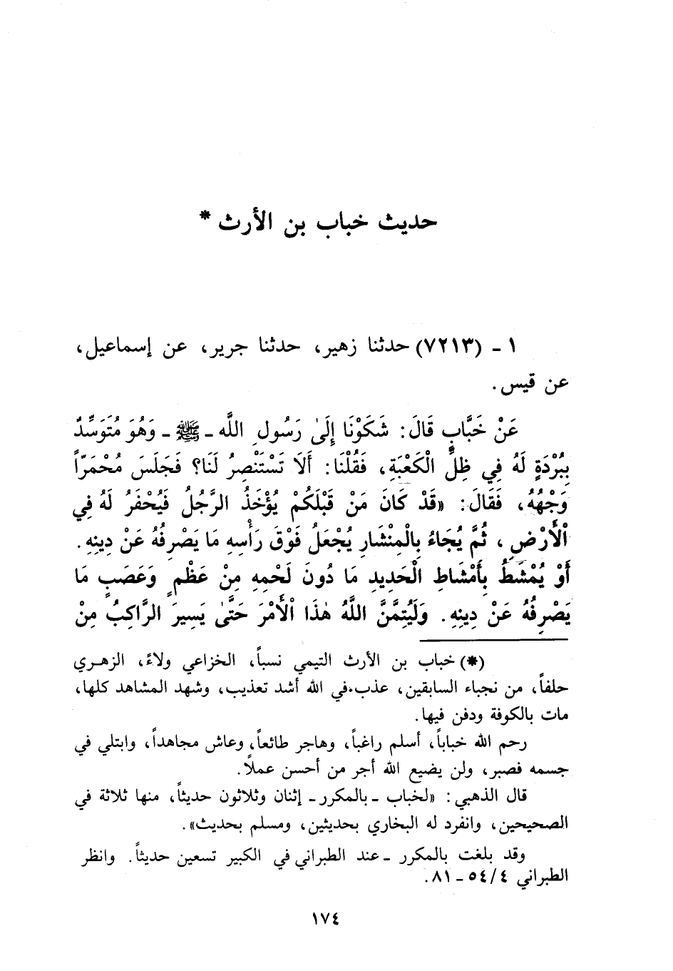 7213 - حَدَّثَنَا زُهَيْرٌ، حَدَّثَنَا جَرِيرٌ، عَنْ إِسْمَاعِيلَ، عَنْ قَيْسٍ، عَنْ خَبَّابٍ قَالَ: شَكَوْنَا إِلَى رَسُولِ اللَّهِ صَلَّى اللهُ عَلَيْهِ وَسَلَّمَ وَهُوَ مُتَوَسِّدٌ بِبُرْدَةٍ لَهُ فِي ظِلِّ الْكَعْبَةِ، فَقُلْنَا: أَلَا تَسْتَنْصِرُ لَنَا؟ فَجَلَسَ مُحْمَرًّا وَجْهُهُ، فَقَالَ: «قَدْ §كَانَ مَنْ قَبْلَكُمْ يُؤْخَذُ الرَّجُلُ فَيُحْفَرُ لَهُ فِي الْأَرْضِ، ثُمَّ يُجَاءُ بِالْمِنْشَارِ يُجْعَلُ فَوْقَ رَأْسِهِ , مَا يَصْرِفُهُ عَنْ دِينِهِ، أَوْ يُمَشَّطُ بِأَمْشَاطِ الْحَدِيدِ مَا دُونَ لَحْمِهِ مِنْ عَظْمٍ وَعَصَبٍ مَا يَصْرِفُهُ عَنْ دِينِهِ، وَلَيُتِمَّنَّ اللَّهُ هَذَا الْأَمْرَ حَتَّى يَسِيرَ الرَّاكِبُ مِنْ صَنْعَاءَ إِلَى حَضْرَمَوْتَ لَا يَخْشَى إِلَّا اللَّهَ عَزَّ وَجَلَّ، وَالذِّئْبَ عَلَى غَنَمِهِ، وَلَكِنَّكُمْ تَعْجَلُونَ» Kإسناده صحيح