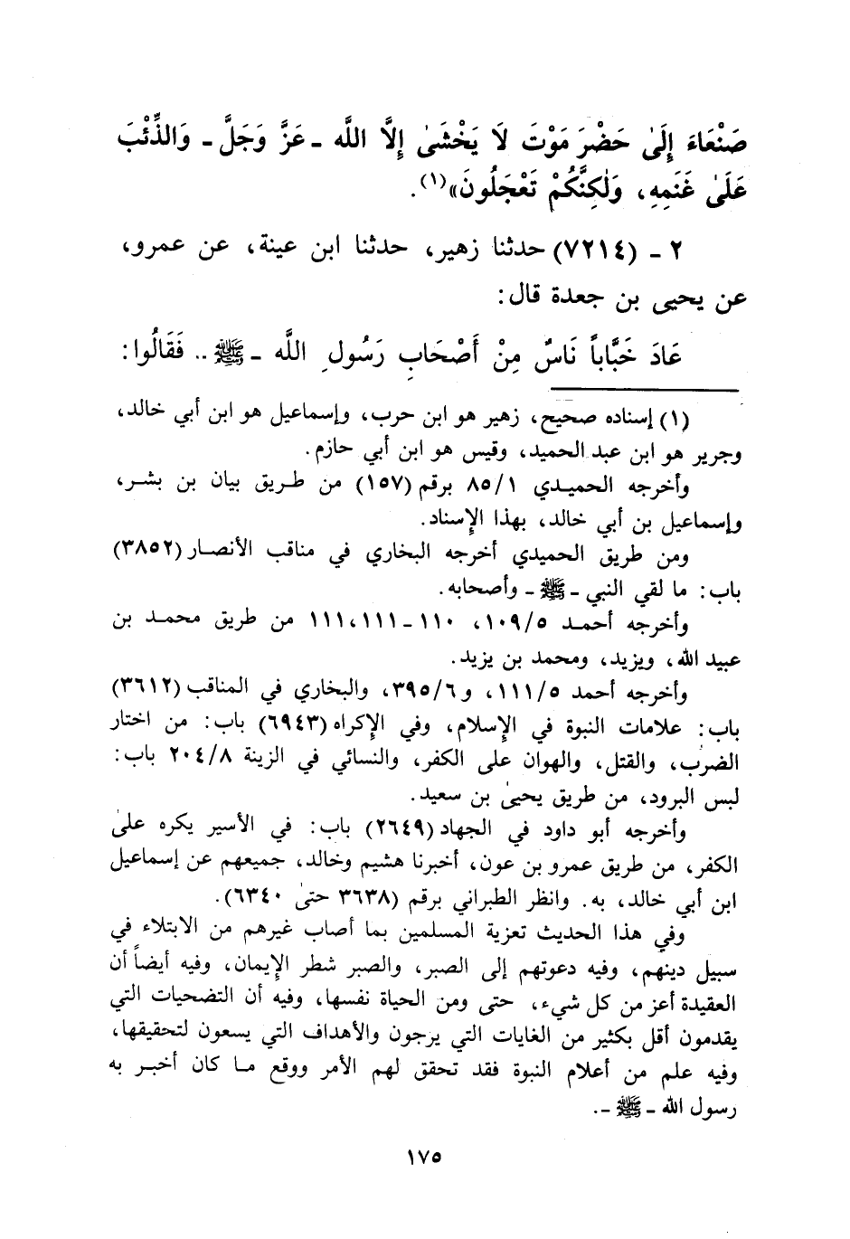 7214 - حَدَّثَنَا زُهَيْرٌ، حَدَّثَنَا ابْنُ عُيَيْنَةَ، عَنْ عَمْرٍو، عَنْ يَحْيَى بْنِ جَعْدَةَ قَالَ: عَادَ خَبَّابًا نَاسٌ مِنْ أَصْحَابِ رَسُولِ اللَّهِ صَلَّى اللهُ عَلَيْهِ وَسَلَّمَ، فَقَالُوا: أَبْشِرْ أَبَا عَبْدِ اللَّهِ تَرِدُ عَلَى مُحَمَّدٍ صَلَّى اللهُ عَلَيْهِ وَسَلَّمَ الْحَوْضَ، فَقَالَ: كَيْفَ بِهَذَا؟ وَأَشَارَ إِلَى أَعَلَى الْبَيْتِ وَأَسْفَلِهِ، وَقَدْ قَالَ رَسُولُ اللَّهِ صَلَّى اللهُ عَلَيْهِ وَسَلَّمَ: «إِنَّمَا §يَكْفِي أَحَدَكُمْ مِنَ الدُّنْيَا كَزَادِ الرَّاكِبِ» Kإسناده صحيح
