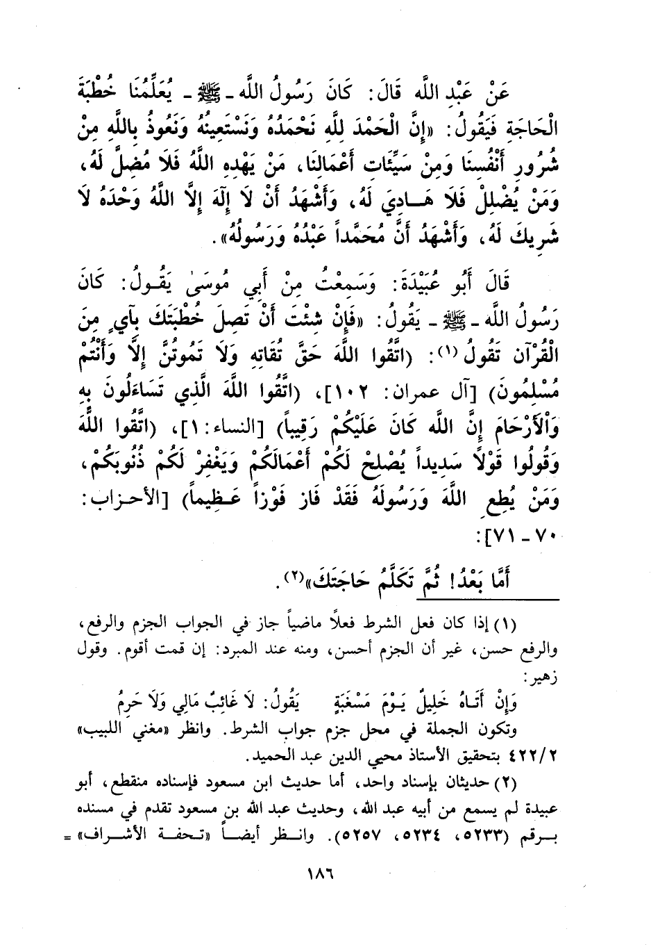 قَالَ أَبُو عُبَيْدَةَ: وَسَمِعْتُ مِنْ أَبِي مُوسَى يَقُولُ: كَانَ رَسُولُ اللَّهِ صَلَّى اللهُ عَلَيْهِ وَسَلَّمَ يَقُولُ: " §فَإِنْ شِئْتَ أَنْ تَصِلَ خُطْبَتَكَ بآيٍ مِنَ الْقُرْآنِ تَقُولُ: {اتَّقُوا اللَّهَ حَقَّ تُقَاتِهِ وَلَا تَمُوتُنَّ إِلَّا وَأَنْتُمْ مُسْلِمُونَ} [آل عمران: 102]، {اتَّقُوا اللَّهَ الَّذِي تَسَاءَلُونَ بِهِ وَالْأَرْحَامَ إِنَّ اللَّهَ كَانَ عَلَيْكُمْ رَقِيبًا} [النساء: 1]، {اتَّقُوا اللَّهَ وَقُولُوا قَوْلًا سَدِيدًا يُصْلِحْ لَكُمْ أَعْمَالَكُمْ وَيَغْفِرْ لَكُمْ ذُنُوبَكُمْ وَمَنْ يُطِعِ اللَّهَ وَرَسُولَهُ فَقَدْ فَازَ فَوْزًا عَظِيمًا} [الأحزاب: 71]، أَمَّا بَعْدُ: ثُمَّ تَكَلَّمْ حَاجَتَكَ "