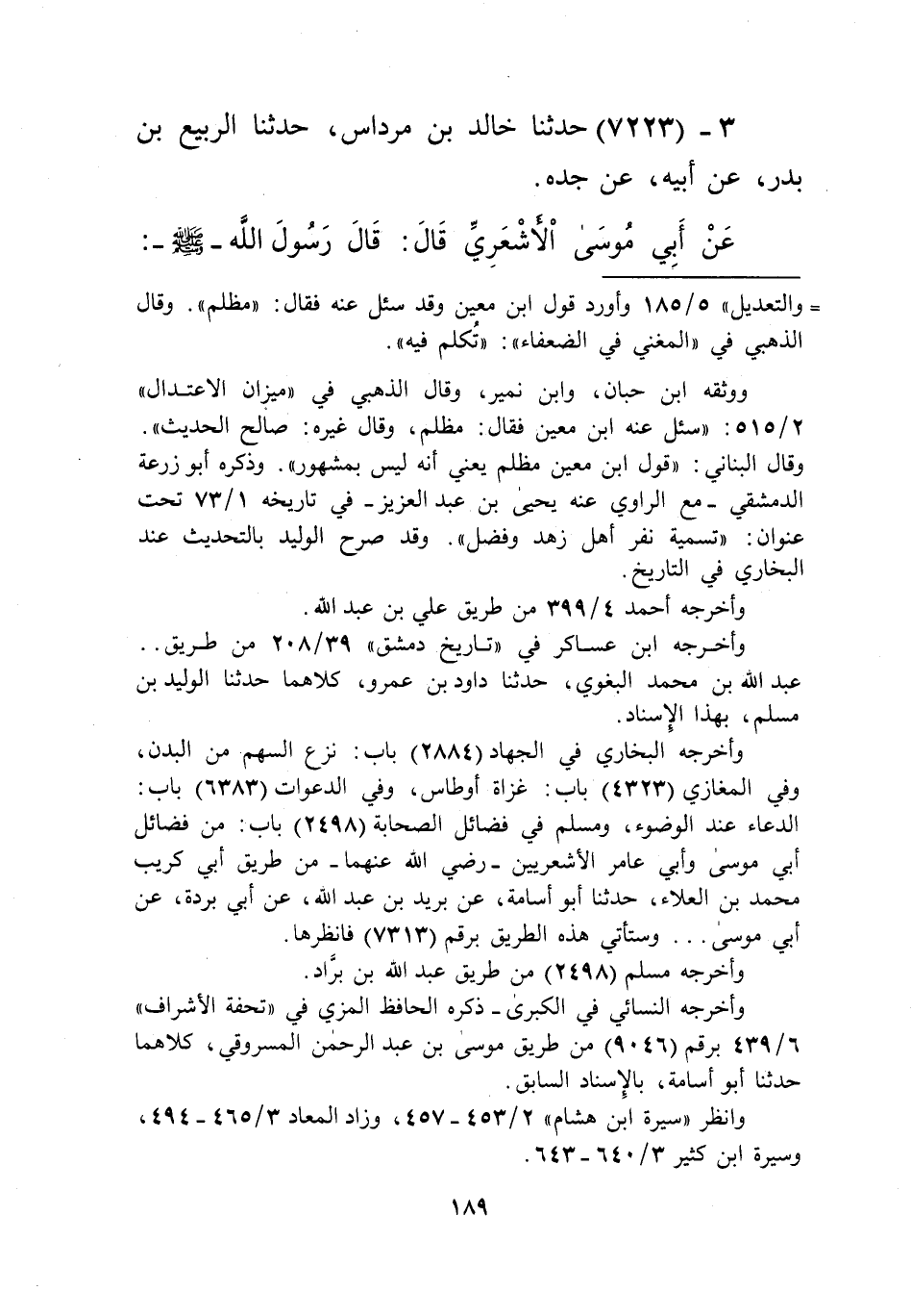 7223 - حَدَّثَنَا خَالِدُ بْنُ مِرْدَاسٍ، حَدَّثَنَا الرَّبِيعُ بْنُ بَدْرٍ، عَنْ أَبِيهِ، عَنْ جَدِّهِ، عَنْ أَبِي مُوسَى الْأَشْعَرِيِّ قَالَ: قَالَ رَسُولُ اللَّهِ صَلَّى اللهُ عَلَيْهِ وَسَلَّمَ: «§اثْنَانِ فَمَا فَوْقَهُمَا جَمَاعَةٌ» Kإسناده ضعيف جدا