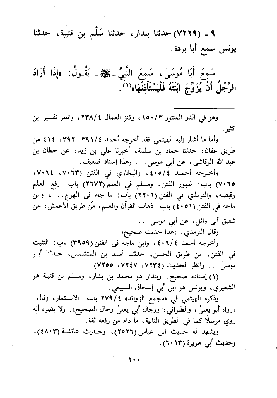 7229 - حَدَّثَنَا بُنْدَارٌ، حَدَّثَنَا سَلْمُ بْنُ قُتَيْبَةَ، حَدَّثَنَا يُونُسُ، سَمِعَ أَبَا بُرْدَةَ، سَمِعَ أَبَا مُوسَى، سَمِعَ النَّبِيَّ صَلَّى اللهُ عَلَيْهِ وَسَلَّمَ يَقُولُ: «§إِذَا أَرَادَ الرَّجُلُ أَنْ يُزَوِّجَ ابْنَتَهُ فَلْيَسْتَأْذِنْهَا» -[201]-، Kإسناده صحيح