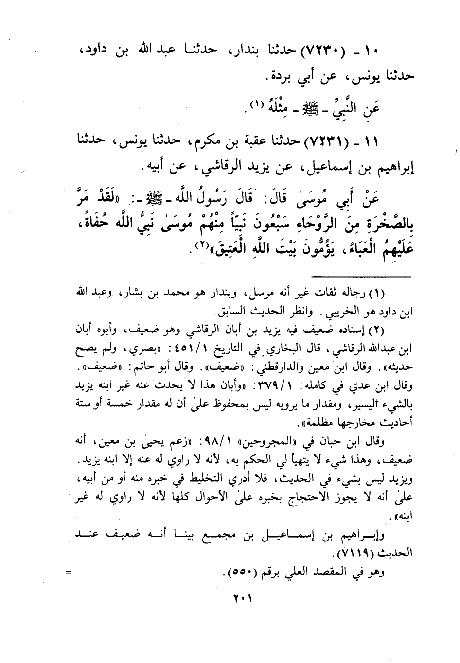 7231 - حَدَّثَنَا عُقْبَةُ بْنُ مُكْرَمٍ، حَدَّثَنَا يُونُسُ، حَدَّثَنَا إِبْرَاهِيمُ بْنُ إِسْمَاعِيلَ، عَنْ يَزِيدَ الرَّقَاشِيِّ، عَنْ أَبِيهِ، عَنْ أَبِي مُوسَى قَالَ: قَالَ رَسُولُ اللَّهِ صَلَّى اللهُ عَلَيْهِ وَسَلَّمَ: «لَقَدْ §مَرَّ بِالصَّخْرَةِ مِنَ الرَّوْحَاءِ سَبْعُونَ نَبِيًّا، مِنْهُمْ مُوسَى نَبِيُّ اللَّهِ , حُفَاةً عَلَيْهِمُ الْعَبَاءُ , يَؤُمُّونَ بَيْتَ اللَّهِ الْعَتِيقَ» Kإسناده ضعيف