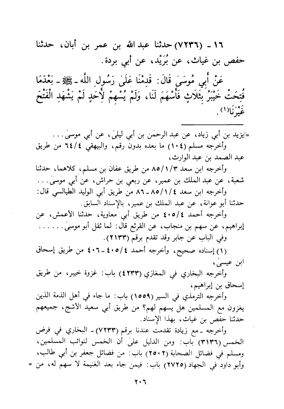 7236 - حَدَّثَنَا عَبْدُ اللَّهِ بْنُ عُمَرَ بْنِ أَبَانَ، حَدَّثَنَا حَفْصُ بْنُ غِيَاثٍ، عَنْ بُرَيْدٍ، عَنْ أَبِي بُرْدَةَ، عَنْ أَبِي مُوسَى قَالَ: «§قَدِمْنَا عَلَى رَسُولِ اللَّهِ صَلَّى اللهُ عَلَيْهِ وَسَلَّمَ بَعْدَمَا فُتِحَتْ خَيْبَرُ بِثَلَاثٍ، فَأَسْهَمَ لَنَا , وَلَمْ يُسْهِمْ لِأَحَدٍ لَمْ يَشْهَدِ الْفَتْحَ غَيْرَنَا» Kإسناده صحيح