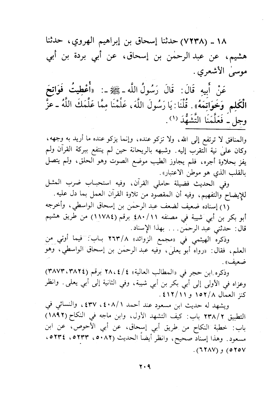 7238 - حَدَّثَنَا إِسْحَاقُ بْنُ إِبْرَاهِيمَ الْهَرَوِيُّ، حَدَّثَنَا هُشَيْمٌ، عَنْ عَبْدِ الرَّحْمَنِ بْنِ إِسْحَاقَ، عَنْ أَبِي بُرْدَةَ بْنِ أَبِي مُوسَى الْأَشْعَرِيِّ، عَنْ أَبِيهِ قَالَ: قَالَ رَسُولُ اللَّهِ صَلَّى اللهُ عَلَيْهِ وَسَلَّمَ: «§أُعْطِيتُ فَوَاتِحَ الْكَلِمِ وَخَوَاتِمَهُ»، قُلْنَا: يَا رَسُولَ اللَّهِ، عَلِّمْنَا مِمَّا عَلَّمَكَ اللَّهُ عَزَّ وَجَلَّ، فَعَلَّمَنَا التَّشَهُّدَKإسناده ضعيف