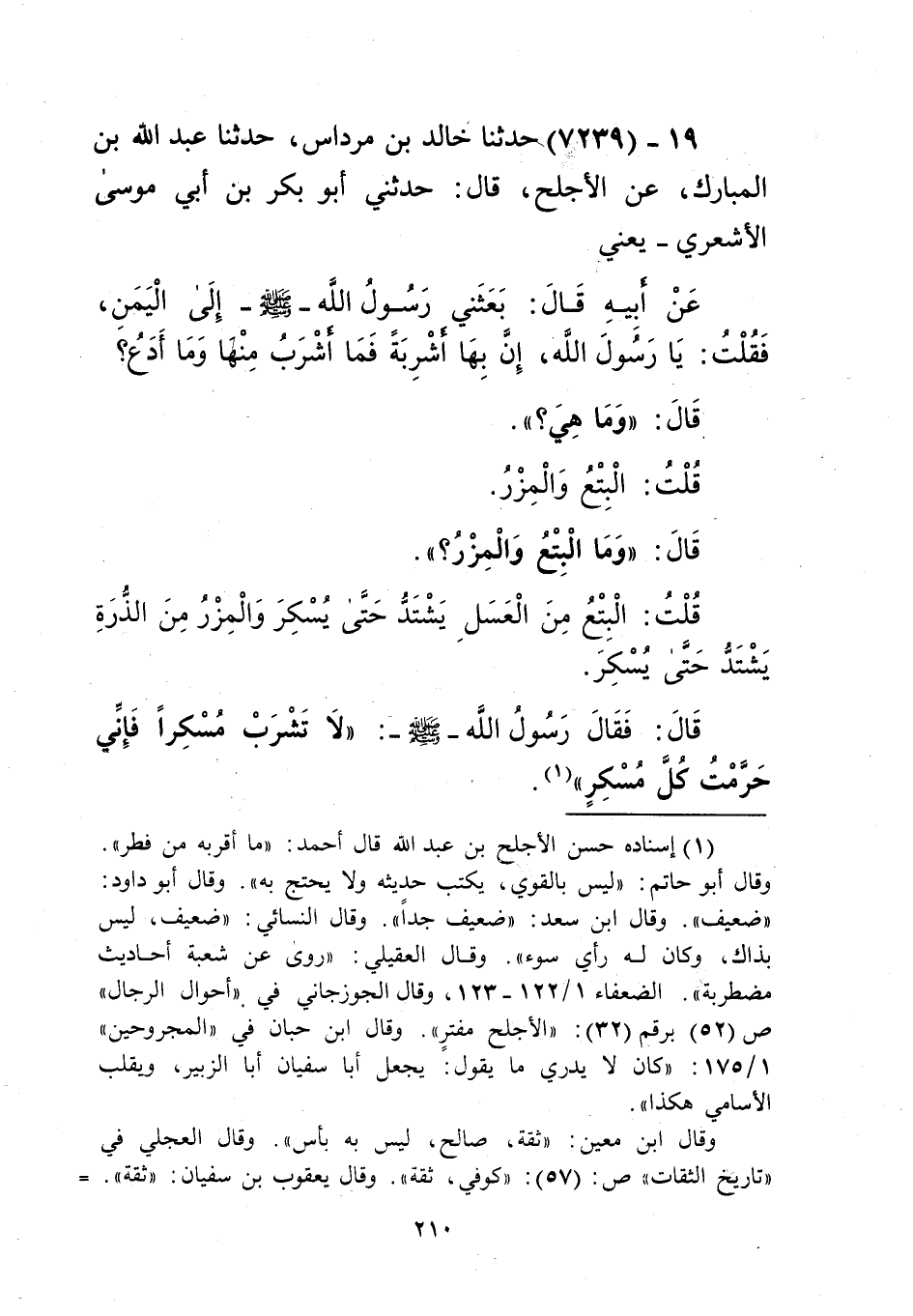 7239 - حَدَّثَنَا خَالِدُ بْنُ مِرْدَاسٍ، حَدَّثَنَا عَبْدُ اللَّهِ بْنُ الْمُبَارَكِ، عَنِ الْأَجْلَحِ قَالَ: حَدَّثَنِي أَبُو بَكْرِ بْنُ أَبِي مُوسَى الْأَشْعَرِيُّ، ـ يَعْنِي ـ عَنْ أَبِيهِ قَالَ: بَعَثَنِي رَسُولُ اللَّهِ صَلَّى اللهُ عَلَيْهِ وَسَلَّمَ إِلَى الْيَمَنِ، فَقُلْتُ: يَا رَسُولَ اللَّهِ، إِنَّ بِهَا أَشْرِبَةً، فَمَا أَشْرَبُ مِنْهَا وَمَا أَدَعُ؟ قَالَ: «وَمَا هِيَ؟»، قُلْتُ: الْبِتْعُ وَالْمِزْرُ، قَالَ: «وَمَا الْبِتْعُ وَالْمِزْرُ؟»، قُلْتُ: الْبِتْعُ مِنَ الْعَسَلِ يَشْتَدُّ حَتَّى يُسْكِرَ، وَالْمِزْرُ مِنَ الذُّرَةِ يَشْتَدُّ حَتَّى يُسْكِرَ، قَالَ: فَقَالَ رَسُولُ اللَّهِ صَلَّى اللهُ عَلَيْهِ وَسَلَّمَ: «§لَا تَشْرَبْ مُسْكِرًا , فَإِنِّي حَرَّمْتُ كُلَّ مُسْكِرٍ» Kإسناده حسن