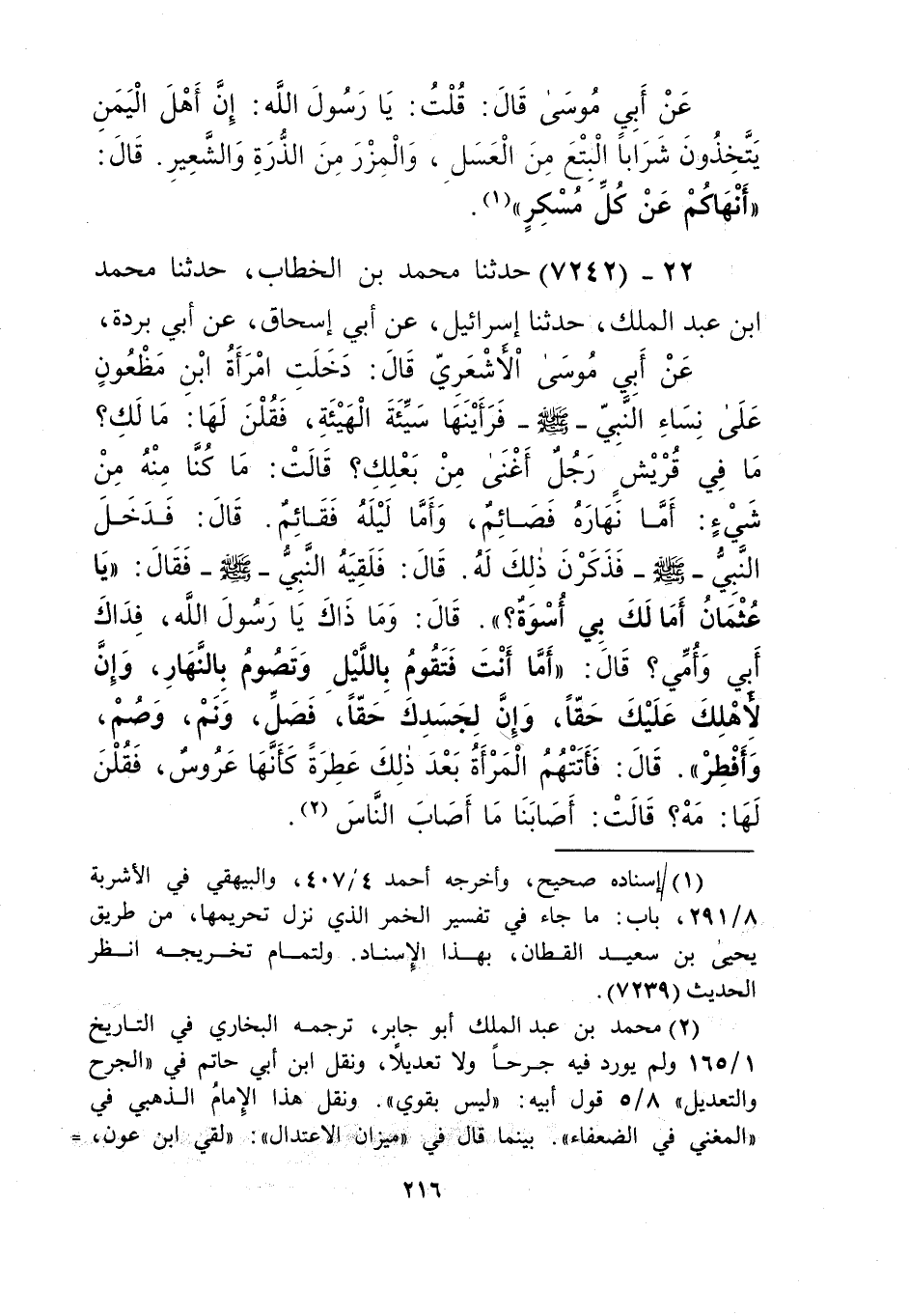 7242 - حَدَّثَنَا مُحَمَّدُ بْنُ الْخَطَّابِ، حَدَّثَنَا مُحَمَّدُ بْنُ عَبْدِ الْمَلِكِ، حَدَّثَنَا إِسْرَائِيلُ، عَنْ أَبِي إِسْحَاقَ، عَنْ أَبِي بُرْدَةَ، عَنْ أَبِي مُوسَى الْأَشْعَرِيِّ قَالَ: دَخَلَتِ امْرَأَةُ ابْنِ مَظْعُونٍ عَلَى نِسَاءِ النَّبِيِّ صَلَّى اللهُ عَلَيْهِ وَسَلَّمَ، فَرَأَيْنَهَا سَيِّئَةَ الْهَيْئَةِ، فَقُلْنَ لَهَا: مَا لَكِ؟ مَا فِي قُرَيْشٍ رَجُلٌ أَغْنَى مِنْ بَعْلِكِ؟ قَالَتْ: مَا كُنَّا مِنْهُ مِنْ شَيْءٍ، أَمَّا نَهَارُهُ فَصَائِمٌ، وَأَمَّا لَيْلُهُ فَقَائِمٌ، قَالَ: فَدَخَلَ النَّبِيُّ صَلَّى اللهُ عَلَيْهِ وَسَلَّمَ، فَذَكَرْنَ ذَلِكَ لَهُ، قَالَ: فَلَقِيَهُ النَّبِيُّ صَلَّى اللهُ عَلَيْهِ وَسَلَّمَ فَقَالَ: «يَا عُثْمَانُ، أَمَا لَكَ بِي أُسْوَةٌ؟»، قَالَ: وَمَا ذَاكَ يَا رَسُولَ اللَّهِ، فِدَاكَ أَبِي وَأُمِّي؟ قَالَ: «§أَمَّا أَنْتَ فَتَقُومُ بِاللَّيْلِ وَتَصُومُ بِالنَّهَارِ، وَإِنَّ لِأَهْلِكَ عَلَيْكَ حَقًّا، وَإِنَّ لِجَسَدِكَ حَقًّا، فَصَلِّ وَنَمْ، وَصُمْ وَأَفْطِرْ»، قَالَ: فَأَتَتْهُمُ الْمَرْأَةُ بَعْدَ ذَلِكَ عَطِرَةً كَأَنَّهَا عَرُوسٌ، فَقُلْنَ لَهَا: مَهْ؟ قَالَتْ: أَصَابَنَا مَا أَصَابَ النَّاسُ