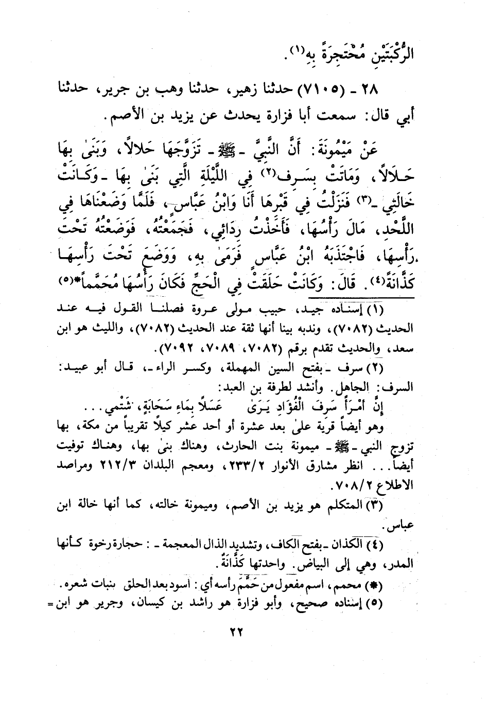 7105 - حَدَّثَنَا زُهَيْرٌ، حَدَّثَنَا وَهْبُ بْنُ جَرِيرٍ، حَدَّثَنَا أَبِي، قَالَ: سَمِعْتُ أَبَا فَزَارَةَ يُحَدِّثُ، عَنْ يَزِيدَ بْنِ الْأَصَمِّ، عَنْ مَيْمُونَةَ، «أَنَّ النَّبِيَّ صَلَّى اللهُ عَلَيْهِ وَسَلَّمَ §تَزَوَّجَهَا حَلَالًا، وَبَنَى بِهَا حَلَالًا، وَمَاتَتْ بِسَرِفٍ فِي اللَّيْلَةِ الَّتِي بَنَى بِهَا»، وَكَانَتْ خَالَتِي، فَنَزَلَتُ فِي قَبْرِهَا أَنَا وَابْنُ عَبَّاسٍ، فَلَمَّا وَضَعْنَاهَا فِي اللَّحْدِ مَالَ رَأْسُهَا، فَأَخَذْتُ رِدَائِي فَجَمَعْتُهُ، فَوَضَعْتُهُ تَحْتَ رَأْسِهَا، فَاجْتَذَبَهُ ابْنُ عَبَّاسٍ، فَرَمَى بِهِ وَوَضَعَ تَحْتَ رَأْسِهَا كَذَّانَةً، قَالَ: وَكَانَتْ حَلَقَتْ فِي الْحَجِّ، فَكَانَ رَأْسُهَا مُحَمَّمًاKإسناده صحيح