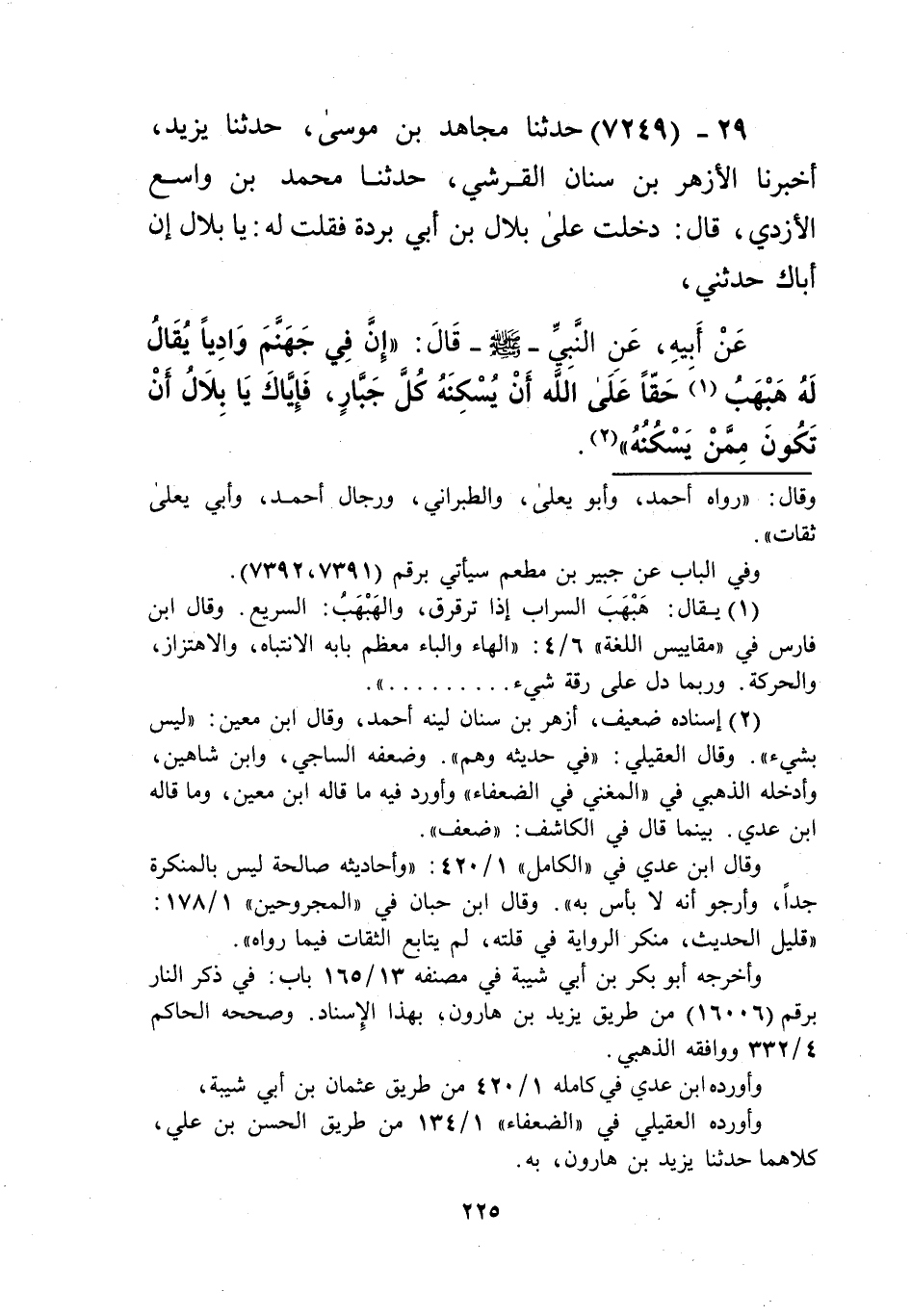 7249 - حَدَّثَنَا مُجَاهِدُ بْنُ مُوسَى، حَدَّثَنَا يَزِيدُ، أَخْبَرَنَا الْأَزْهَرُ بْنُ سِنَانٍ الْقُرَشِيُّ، حَدَّثَنَا مُحَمَّدُ بْنُ وَاسِعٍ الْأَزْدِيُّ، قَالَ: دَخَلْتُ عَلَى بِلَالِ بْنِ أَبِي بُرْدَةَ، فَقُلْتُ لَهُ: يَا بِلَالُ إِنَّ أَبَاكَ حَدَّثَنِي، عَنْ أَبِيهِ، عَنِ النَّبِيِّ صَلَّى اللهُ عَلَيْهِ وَسَلَّمَ قَالَ: " إِنَّ §فِي جَهَنَّمَ وَادِيًا يُقَالُ لَهُ: هَبْهَبُ حَقًّا عَلَى اللَّهِ أَنْ يُسْكِنَهُ كُلَّ جَبَّارٍ، فَإِيَّاكَ يَا بِلَالُ أَنْ تَكُونَ مِمَّنْ يَسْكُنُهُ "Kإسناده ضعيف