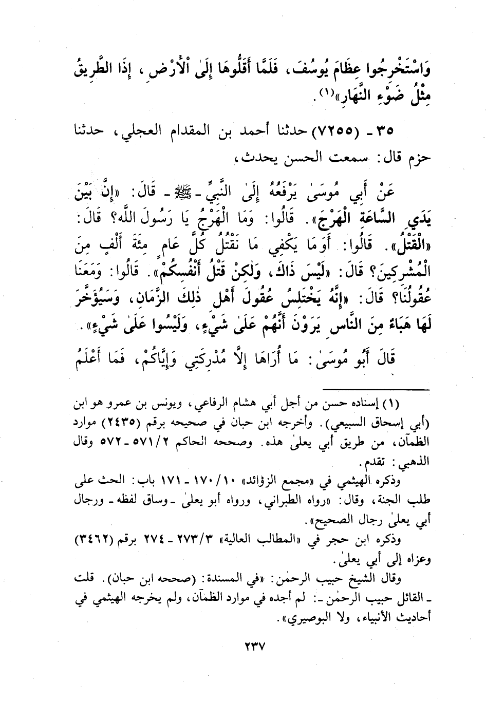 7255 - حَدَّثَنَا أَحْمَدُ بْنُ الْمِقْدَامِ الْعِجْلِيُّ، حَدَّثَنَا حَزْمٌ، قَالَ: سَمِعْتُ الْحَسَنَ يُحَدِّثُ، عَنْ أَبِي مُوسَى يَرْفَعُهُ إِلَى النَّبِيِّ صَلَّى اللهُ عَلَيْهِ وَسَلَّمَ قَالَ: «إِنَّ §بَيْنَ يَدَيِ السَّاعَةِ الْهَرْجَ»، قَالُوا: وَمَا الْهَرْجُ يَا رَسُولَ اللَّهِ؟ قَالَ: «الْقَتْلُ»، قَالُوا: أَوَ مَا يَكْفِي مَا نَقْتُلُ كُلَّ عَامٍ مِائَةَ أَلْفٍ مِنَ الْمُشْرِكِينَ؟ قَالَ: «لَيْسَ ذَاكَ، وَلَكِنْ قَتْلُ أَنْفُسِكُمْ»، قَالُوا: وَمَعَنَا عُقُولُنَا؟ قَالَ: «إِنَّهُ يَخْتَلِسُ عُقُولَ أَهْلِ ذَلِكَ الزَّمَانِ، وَسَيُؤَخَّرُ لَهَا هَبَاءٌ مِنَ النَّاسِ يَرَوْنَ أَنَّهُمْ عَلَى شَيْءٍ وَلَيْسُوا عَلَى شَيْءٍ»، قَالَ أَبُو مُوسَى: مَا أُرَاهَا إِلَّا مُدْرِكَتِي وَإِيَّاكُمْ، فَمَا أَعْلَمُ الْمَخْرَجَ مِنْهَا فِيمَا عُهِدَ إِلَيْنَا إِلَّا أَنْ نَخْرُجَ مِنْهَا كَيَوْمِ دَخَلْنَا فِيهَاKإسناده ضعيف