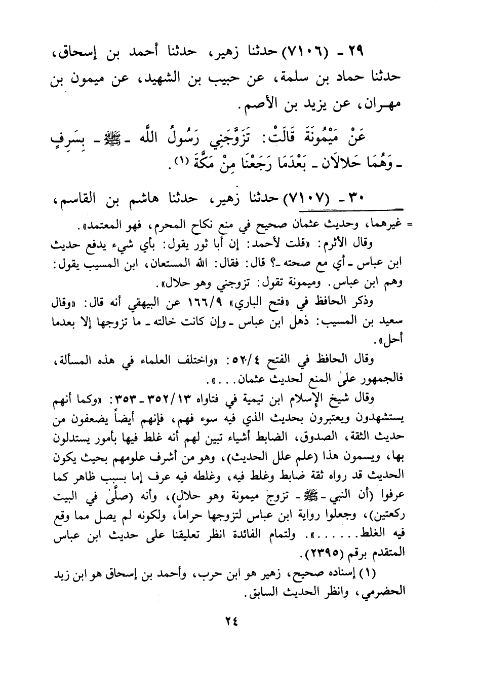 7106 - حَدَّثَنَا زُهَيْرٌ، حَدَّثَنَا أَحْمَدُ بْنُ إِسْحَاقَ، حَدَّثَنَا حَمَّادُ بْنُ سَلَمَةَ، عَنْ حَبِيبِ بْنِ الشَّهِيدِ، عَنْ مَيْمُونِ بْنِ مِهْرَانَ، عَنْ يَزِيدَ بْنِ الْأَصَمِّ، عَنْ مَيْمُونَةَ قَالَتْ: «§تَزَوَّجَنِي رَسُولُ اللَّهِ صَلَّى اللهُ عَلَيْهِ وَسَلَّمَ بِسَرِفَ ـ وَهُمَا حَلَالَانِ ـ بَعْدَمَا رَجَعْنَا مِنْ مَكَّةَ» Kإسناده صحيح