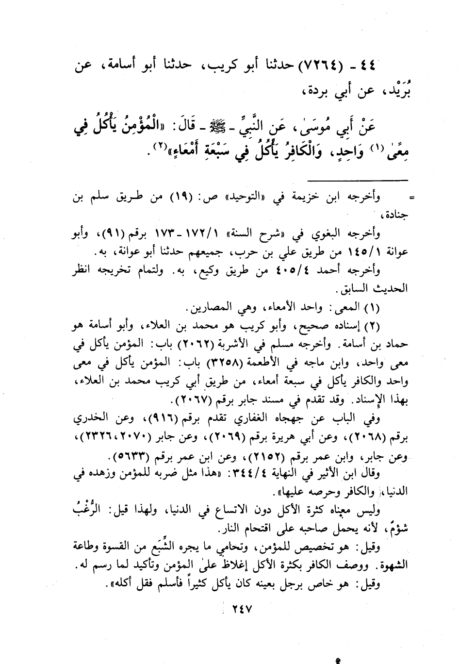7264 - حَدَّثَنَا أَبُو كُرَيْبٍ، حَدَّثَنَا أَبُو أُسَامَةَ، عَنْ بُرَيْدٍ، عَنْ أَبِي بُرْدَةَ، عَنْ أَبِي مُوسَى عَنِ النَّبِيِّ صَلَّى اللهُ عَلَيْهِ وَسَلَّمَ قَالَ: «§الْمُؤْمِنُ يَأْكُلُ فِي مِعًى وَاحِدٍ، وَالْكَافِرُ يَأْكُلُ فِي سَبْعَةِ أَمْعَاءٍ» Kإسناده صحيح