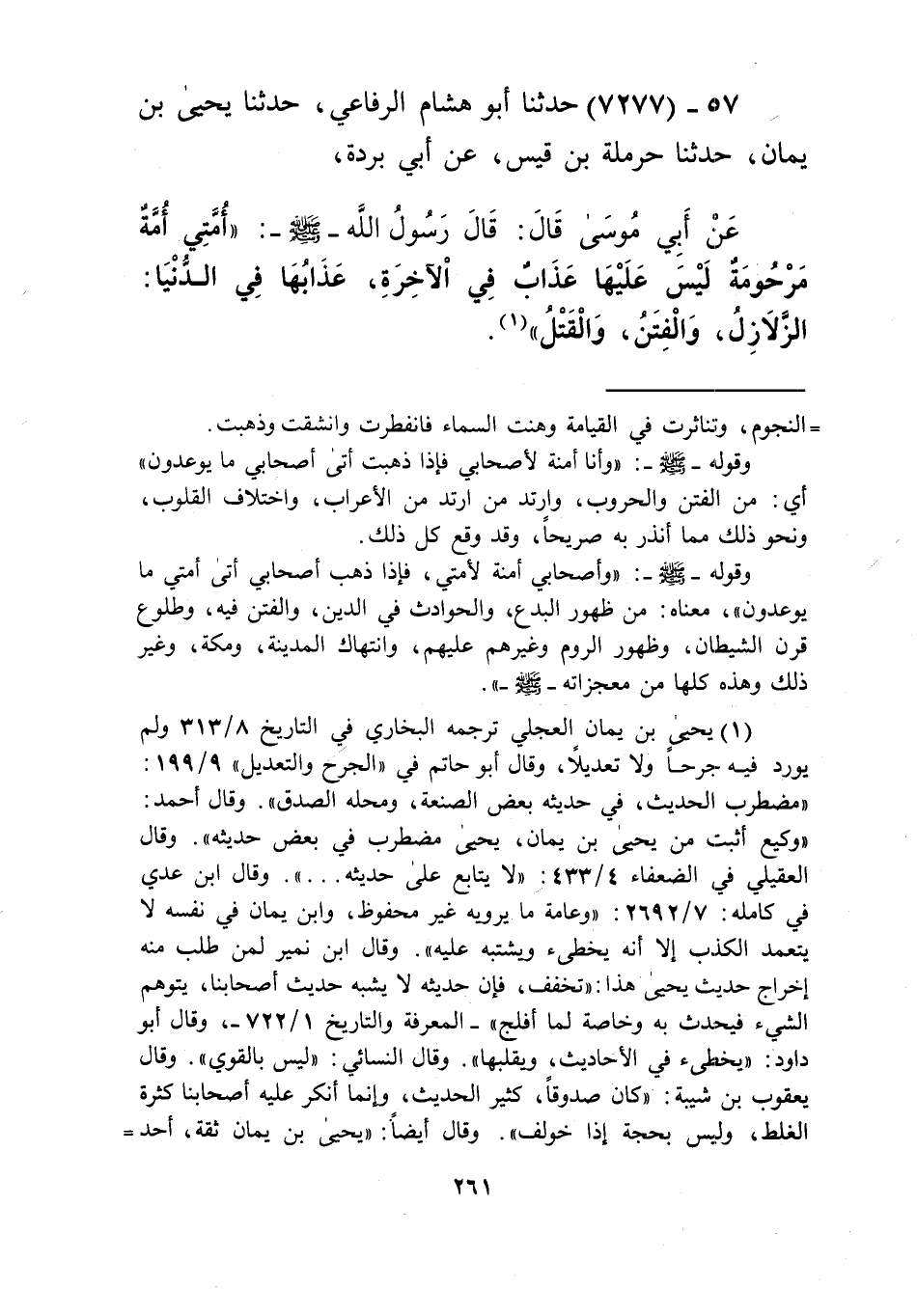 7277 - حَدَّثَنَا أَبُو هِشَامٍ الرِّفَاعِيُّ، حَدَّثَنَا يَحْيَى بْنُ يَمَانٍ، حَدَّثَنَا حَرْمَلَةُ بْنُ قَيْسٍ، عَنْ أَبِي بُرْدَةَ، عَنْ أَبِي مُوسَى قَالَ: قَالَ رَسُولُ اللَّهِ صَلَّى اللهُ عَلَيْهِ وَسَلَّمَ: «§أُمَّتِي أُمَّةٌ مَرْحُومَةٌ , لَيْسَ عَلَيْهَا عَذَابٌ فِي الْآخِرَةِ، عَذَابُهَا فِي الدُّنْيَا الزَّلَازِلُ وَالْفِتَنُ وَالْقَتْلُ»