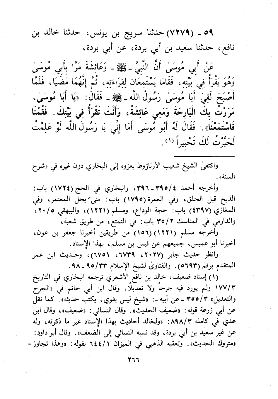 7279 - حَدَّثَنَا سُرَيْجُ بْنُ يُونُسَ، حَدَّثَنَا خَالِدُ بْنُ نَافِعٍ، حَدَّثَنَا سَعِيدُ بْنُ أَبِي بُرْدَةَ، عَنْ أَبِي بُرْدَةَ، عَنْ أَبِي مُوسَى، أَنَّ النَّبِيَّ صَلَّى اللهُ عَلَيْهِ وَسَلَّمَ وَعَائِشَةَ مَرَّا بِأَبِي مُوسَى وَهُوَ يُقْرَأُ فِي بَيْتِهِ، فَقَامَا يَسْتَمِعَانِ لِقِرَاءَتِهِ، ثُمَّ إِنَّهُمَا مَضَيَا، فَلَمَّا أَصْبَحَ لَقِيَ أَبَا مُوسَى رَسُولُ اللَّهِ صَلَّى اللهُ عَلَيْهِ وَسَلَّمَ، فَقَالَ: «يَا أَبَا مُوسَى §مَرَرْتُ بِكَ الْبَارِحَةَ وَمَعِي عَائِشَةُ، وَأَنْتَ تَقْرَأُ فِي بَيْتِكَ، فَقُمْنَا فَاسْتَمَعْنَا»، فَقَالَ لَهُ أَبُو مُوسَى: أَمَا إِنِّي يَا رَسُولَ اللَّهِ , لَوْ عَلِمْتُ لَحَبَّرْتُ لَكَ تَحْبِيرًاKإسناده ضعيف