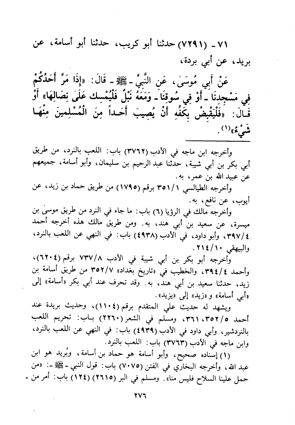 7291 - حَدَّثَنَا أَبُو كُرَيْبٍ، حَدَّثَنَا أَبُو أُسَامَةَ، عَنْ بُرَيْدٍ، عَنْ أَبِي بُرْدَةَ، عَنْ أَبِي مُوسَى، عَنِ النَّبِيِّ صَلَّى اللهُ عَلَيْهِ وَسَلَّمَ قَالَ: " §إِذَا مَرَّ أَحَدُكُمْ فِي مَسْجِدِنَا، أَوْ فِي سُوقِنَا وَمَعَهُ نَبْلٌ فَلْيُمْسِكْ عَلَى نِصَالِهَا ـ أَوْ قَالَ: فَلْيَقْبِضْ بِكَفِّهِ، أَنْ يُصِيبَ أَحَدًا مِنَ الْمُسْلِمِينَ مِنْهَا شَيْءٌ "Kإسناده صحيح