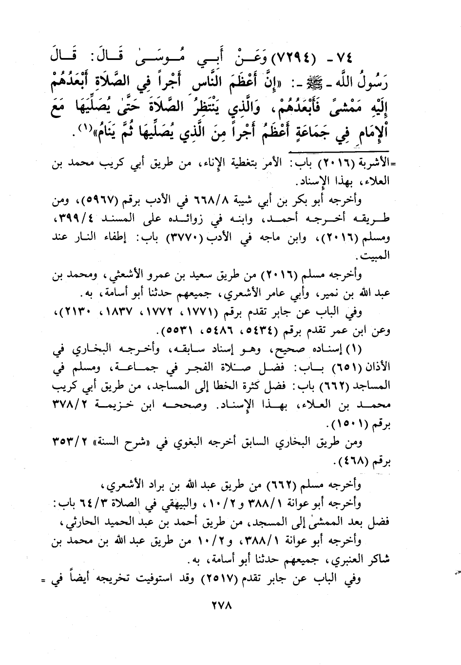 7294 - وَعَنْ أَبِي مُوسَى قَالَ: قَالَ رَسُولُ اللَّهِ صَلَّى اللهُ عَلَيْهِ وَسَلَّمَ: «إِنَّ §أَعْظَمَ النَّاسِ أَجْرًا فِي الصَّلَاةِ أَبْعَدُهُمْ إِلَيْهِ مَمْشًى، فَأَبْعَدُهُمْ، وَالَّذِي يَنْتَظِرُ الصَّلَاةَ حَتَّى يُصَلِّيَهَا مَعَ الْإِمَامِ فِي جَمَاعَةٍ , أَعْظَمُ أَجْرًا مِنَ الَّذِي يُصَلِّيهَا ثُمَّ يَنَامُ» Kإسناده صحيح