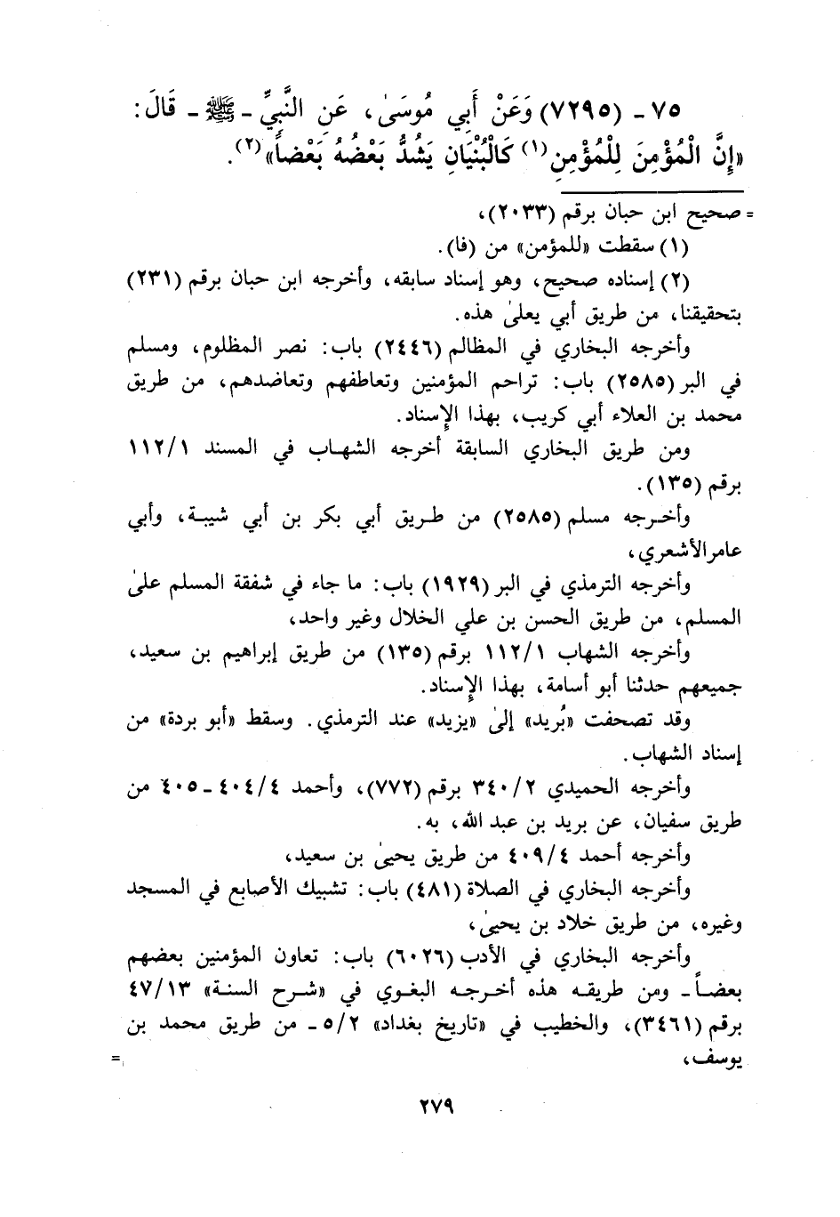 7295 - وَعَنْ أَبِي مُوسَى، عَنِ النَّبِيِّ صَلَّى اللهُ عَلَيْهِ وَسَلَّمَ قَالَ: «إِنَّ §الْمُؤْمِنَ لِلْمُؤْمِنِ كَالْبُنْيَانِ يَشُدُّ بَعْضُهُ بَعْضًا» Kإسناده صحيح