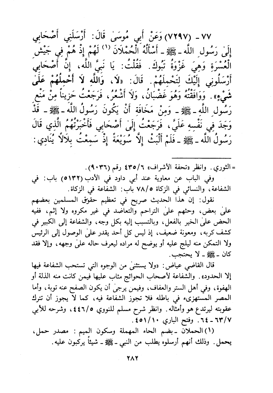 7297 - وَعَنْ أَبِي مُوسَى قَالَ: أَرْسَلَنِي أَصْحَابِي إِلَى رَسُولِ اللَّهِ صَلَّى اللهُ عَلَيْهِ وَسَلَّمَ أَسْأَلُهُ الْحُمْلَانَ لَهُمْ، إِذْ هُمْ فِي جَيْشِ الْعُسْرَةِ، وَهِيَ غَزْوَةُ تَبُوكَ، فَقُلْتُ: يَا نَبِيَّ اللَّهِ، إِنَّ أَصْحَابِي أَرْسَلُونِي إِلَيْكَ لِتَحْمِلَهُمْ، قَالَ: «لَا، وَاللَّهِ لَا أَحْمِلُهُمْ عَلَى شَيْءٍ»، وَوَافَقْتُهُ وَهُوَ غَضْبَانُ وَلَا أَشْعُرُ، فَرَجَعْتُ حَزِينًا مِنْ مَنْعِ رَسُولِ اللَّهِ صَلَّى اللهُ عَلَيْهِ وَسَلَّمَ، وَمِنْ مَخَافَةِ أَنْ يَكُونَ رَسُولُ اللَّهِ صَلَّى اللهُ عَلَيْهِ وَسَلَّمَ قَدْ وَجَدَ فِي نَفْسِهِ عَلَيَّ، فَرَجَعْتُ إِلَى أَصْحَابِي فَأَخْبَرْتُهُمُ الَّذِي قَالَ رَسُولُ اللَّهِ صَلَّى اللهُ عَلَيْهِ وَسَلَّمَ، فَلَمْ أَلْبَثْ إِلَّا سُوَيْعَةً إِذْ سَمِعْتُ بِلَالًا يُنَادِي: أَيْنَ عَبْدُ اللَّهِ بْنُ قَيْسٍ؟ فَأَجَبْتُهُ، فَقَالَ: أَجِبْ رَسُولَ اللَّهِ صَلَّى اللهُ عَلَيْهِ وَسَلَّمَ يَدْعُوكَ، فَلَمَّا أَتَيْتُ رَسُولَ اللَّهِ صَلَّى اللهُ عَلَيْهِ وَسَلَّمَ قَالَ: " §خُذْ هَذَيْنِ الْقَرِينَيْنِ، وَهَذَيْنِ الْقَرِينَيْنِ ـ وَهَذَيْنِ الْقَرِينَيْنِ لِسِتَّةِ أَبْعِرَةٍ ابْتَاعَهُنَّ حِينَئِذٍ مِنْ سَعْدٍ ـ فَانْطَلِقْ بِهِنَّ إِلَى أَصْحَابِكَ، فَقُلْ: إِنَّ اللَّهَ عَزَّ وَجَلَّ ـ أَوْ إِنَّ رَسُولَ اللَّهِ ـ صَلَّى اللهُ عَلَيْهِ وَسَلَّمَ يَحْمِلُكُمْ عَلَى هَؤُلَاءِ , فَارْكَبُوهُنَّ "، قَالَ أَبُو مُوسَى: فَانْطَلَقْتُ إِلَى أَصْحَابِي بِهِنَّ، فَقُلْتُ: إِنَّ رَسُولَ اللَّهِ صَلَّى اللهُ عَلَيْهِ وَسَلَّمَ يَحْمِلُ عَلَى هَؤُلَاءِ، وَلَكِنْ وَاللَّهِ لَا أَدَعُكُمْ حَتَّى يَنْطَلِقَ مَعِي بَعْضُكُمْ إِلَى مَنْ سَمِعَ مَقَالَ رَسُولِ اللَّهِ صَلَّى اللهُ عَلَيْهِ وَسَلَّمَ حِينَ سَأَلْتُهُ لَكُمْ، وَمَنَعَهُ فِي أَوَّلِ مَرَّةٍ، ثُمَّ أَعْطَاهُ إِيَّايَ بَعْدَ ذَلِكَ، لَا تَظُنُّوا أَنِّي حَدَّثْتُكُمْ شَيْئًا لَمْ يُقُلْهُ، فَقَالُوا: وَاللَّهِ إِنَّكَ عِنْدَنَا لَمُصَدَّقٌ، وَلَنَفْعَلَنَّ مَا أَحْبَبْتَ، فَانْطَلَقَ أَبُو مُوسَى بِنَفَرٍ مِنْهُمْ حَتَّى أَتَوُا الَّذِينَ سَمِعُوا قَوْلَ رَسُولِ اللَّهِ صَلَّى اللهُ عَلَيْهِ وَسَلَّمَ، وَمَنْعَهُ إِيَّاهُمْ، ثُمَّ أَعْطَاهُ بَعْدَ، فَحَدَّثَهُمْ مِثْلَ مَا حَدَّثَهُمْ أَبُو مُوسَى سَوَاءًKإسناده صحيح