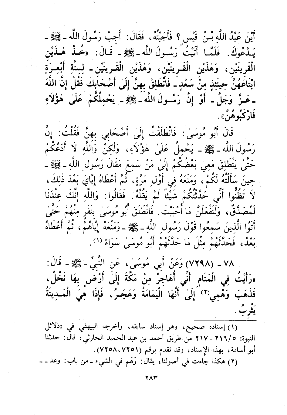 7298 - وَعَنْ أَبِي مُوسَى، عَنِ النَّبِيِّ صَلَّى اللهُ عَلَيْهِ وَسَلَّمَ قَالَ: «§رَأَيْتُ فِي الْمَنَامِ أَنِّي أُهَاجِرُ مِنْ مَكَّةَ إِلَى أَرْضٍ بِهَا نَخْلٌ، فَذَهَبَ وَهْمِي إِلَى أَنَّهَا الْيَمَامَةُ وَهَجَرُ، فَإِذَا هِيَ الْمَدِينَةُ يَثْرِبُ، وَرَأَيْتُ فِي رُؤْيَايَ هَذِهِ أَنِّي هَزَزْتُ سَيْفًا فَانْقَطَعَ صَدْرُهُ، فَإِذَا هُوَ مَا أُصِيبَ مِنَ الْمُؤْمِنِينَ يَوْمَ أُحُدٍ، وَهَزَزْتُهُ أُخْرَى فَعَادَ خَيْرًا مِمَّا كَانَ، فَإِذَا هُوَ مَا جَاءَ اللَّهُ بِهِ مِنَ الْفَتْحِ وَاجْتِمَاعِ الْمُؤْمِنِينَ، وَرَأَيْتُ فِيهَا أَيْضًا بَقَرًا، وَاللَّهِ خَيْرٌ، فَإِذَا هُمُ النَّفَرُ مِنَ الْمُؤْمِنِينَ يَوْمَ أُحُدٍ، وَإِذَا الْخَيْرُ مَا جَاءَ اللَّهُ بِهِ مِنَ الْخَيْرِ بَعْدُ، وَثَوَابُ الصِّدْقِ أَتَانَا بَعْدُ يَوْمَ بَدْرٍ» Kإسناده صحيح