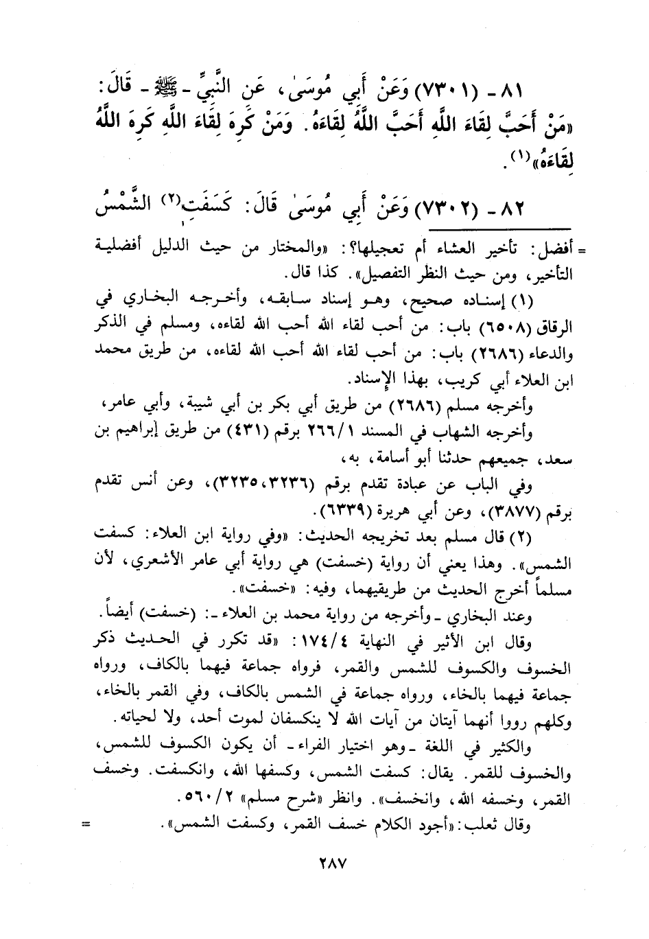 7301 - عَنْ أَبِي مُوسَى، عَنِ النَّبِيِّ صَلَّى اللهُ عَلَيْهِ وَسَلَّمَ: «§مَنْ أَحَبَّ لِقَاءَ اللَّهِ أَحَبَّ اللَّهُ لِقَاءَهُ، وَمَنْ كَرِهَ لِقَاءَ اللَّهِ كَرِهَ اللَّهُ لِقَاءَهُ» Kإسناده صحيح