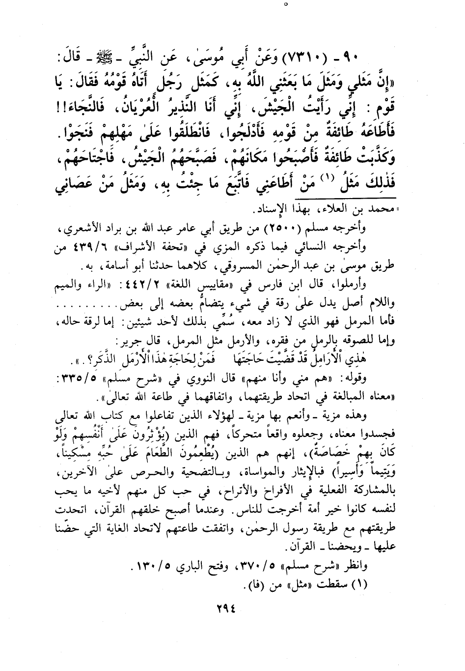7310 - وَعَنْ أَبِي مُوسَى، عَنِ النَّبِيِّ صَلَّى اللهُ عَلَيْهِ وَسَلَّمَ قَالَ: " إِنَّ §مَثَلِي وَمَثَلَ مَا بَعَثَنِي اللَّهُ بِهِ كَمَثَلِ رَجُلٍ أَتَاهُ قَوْمُهُ فَقَالَ: يَا قَوْمِ إِنِّي رَأَيْتُ الْجَيْشَ، إِنِّي أَنَا النَّذِيرُ الْعُرْيَانُ، فَالنَّجَاءَ، فَأَطَاعَهُ طَائِفَةٌ مِنْ قَوْمِهِ فَأَدْلَجُوا فَانْطَلَقُوا عَلَى مَهَلِهِمْ , فَنَجَوْا، وَكَذَّبَتْ طَائِفَةٌ فَأَصْبَحُوا مَكَانَهُمْ، فَصَبَّحَهُمُ الْجَيْشُ فَاجْتَاحَهُمْ، فَذَلِكَ مَثَلُ مَنْ أَطَاعَنِي فَاتَّبَعَ مَا جِئْتُ بِهِ، وَمَثَلُ مَنْ عَصَانِي وَكَذَّبَ مَا جِئْتُ بِهِ مِنَ الْحَقِّ "Kإسناده صحيح