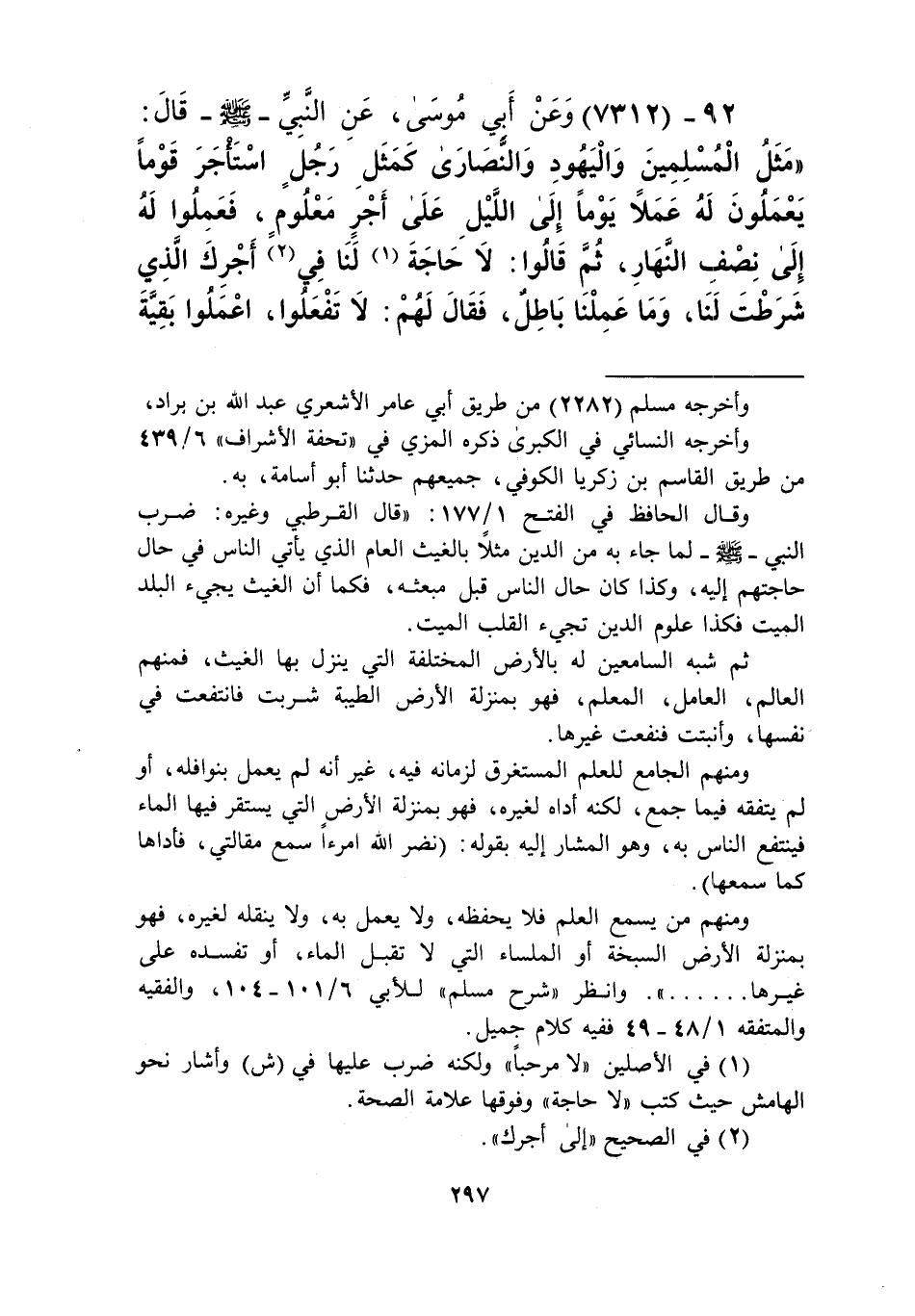 7312 - وَعَنْ أَبِي مُوسَى، عَنِ النَّبِيِّ صَلَّى اللهُ عَلَيْهِ وَسَلَّمَ قَالَ: " §مَثَلُ الْمُسْلِمِينَ وَالْيَهُودِ وَالنَّصَارَى كَمَثَلِ رَجُلٍ اسْتَأْجَرَ قَوْمًا يَعْمَلُونَ لَهُ عَمَلًا يَوْمًا إِلَى اللَّيْلِ عَلَى أَجْرٍ مَعْلُومٍ، فَعَمِلُوا لَهُ إِلَى نِصْفِ النَّهَارِ، ثُمَّ قَالُوا: لَا حَاجَةَ لَنَا فِي أَجْرِكَ الَّذِي شَرَطْتَ لَنَا، وَمَا عَمِلْنَا بَاطِلٌ، فَقَالَ لَهُمْ: لَا تَفْعَلُوا، اعْمَلُوا بَقِيَّةَ -[298]- يَوْمِكُمْ وَخُذُوا أَجْرَكُمْ كَامِلًا، فَأَبَوْا وَتَرَكُوا ذَلِكَ عَلَيْهِ، فَاسْتَأْجَرَ قَوْمًا آخَرِينَ بَعْدَهُمْ وَقَالَ: اعْمَلُوا بَقِيَّةَ يَوْمِكُمْ وَلَكُمُ الَّذِي شَرَطْتُ لَهُمْ مِنَ الْأَجْرِ، فَعَمِلُوا حَتَّى إِذَا كَانَ حِينَ صَلَاةِ الْعَصْرِ قَالُوا: لَكَ الَّذِي عَمِلْنَا بَاطِلٌ، وَلَكَ الْأَجْرُ الَّذِي جَعَلْتَ لَنَا، لَا حَاجَةَ لَنَا فِيهِ، قَالَ: اعْمَلُوا بَقِيَّةَ عَمَلِكُمْ , فَإِنَّ مَا بَقِيَ مِنَ النَّهَارِ شَيْءٌ يَسِيرٌ , ثُمَّ خُذُوا أَجْرَكُمْ، فَأَبَوْا عَلَيْهِ، فَاسْتَأْجَرَ قَوْمًا آخَرِينَ، فَعَمِلُوا لَهُ بَقِيَّةَ يَوْمِهِمْ حَتَّى غَابَتِ الشَّمْسُ وَاسْتَكْمَلُوا أَجْرَ الْفَرِيقَيْنِ كِلَيْهِمَا وَالْأَجْرَ كُلَّهُ، فَذَلِكَ مَثَلُ الْيَهُودِ وَالنَّصَارَى وَالَّذِينَ تَرَكُوا مَا أَمَرَهُمُ اللَّهُ بِهِ، وَمَثَلُ الْمُسْلِمِينَ الَّذِينَ قَبِلُوا هُدَى اللَّهِ وَمَا جَاءَ بِهِ رَسُولُهُ "Kإسناده صحيح