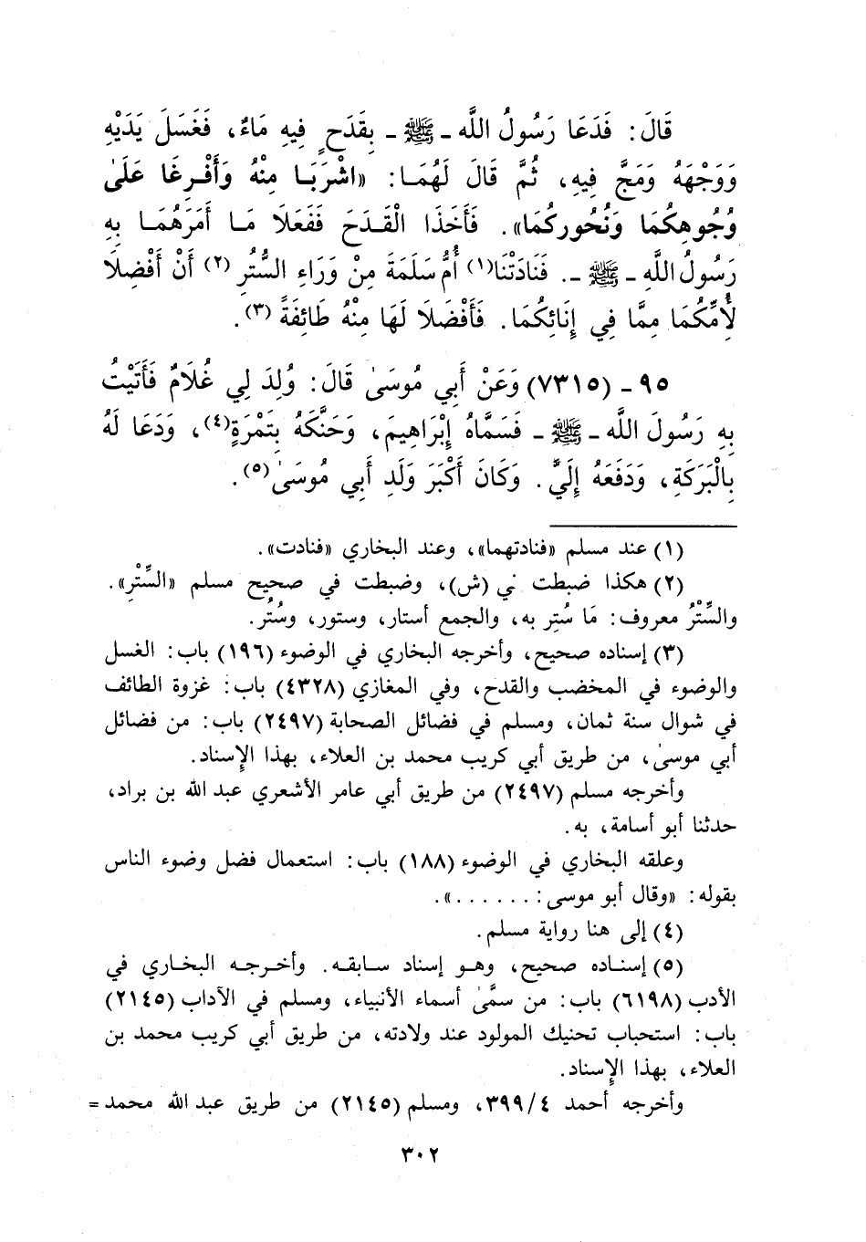 7315 - وَعَنْ أَبِي مُوسَى قَالَ: «وُلِدَ لِي غُلَامٌ، فَأَتَيْتُ بِهِ رَسُولَ اللَّهِ صَلَّى اللهُ عَلَيْهِ وَسَلَّمَ، §فَسَمَّاهُ إِبْرَاهِيمَ، وَحَنَّكَهُ بِتَمْرَةٍ، وَدَعَا لَهُ بِالْبَرَكَةِ، وَدَفَعَهُ إِلَيَّ»، وَكَانَ أَكْبَرَ وَلَدِ أَبِي مُوسَىKإسناده صحيح