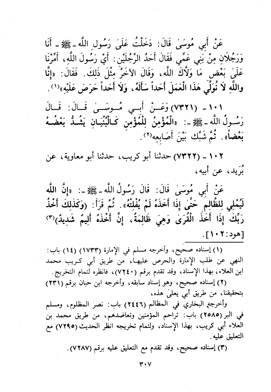 7322 - حَدَّثَنَا أَبُو كُرَيْبٍ، حَدَّثَنَا أَبُو مُعَاوِيَةَ، عَنْ بُرَيْدٍ، عَنْ أَبِيهِ، عَنْ أَبِي مُوسَى قَالَ: قَالَ رَسُولُ اللَّهِ صَلَّى اللهُ عَلَيْهِ وَسَلَّمَ: «إِنَّ §اللَّهَ لَيُمْلِي لِلظَّالِمِ حَتَّى إِذَا أَخَذَهُ لَمْ يُفْلِتْهُ»، ثُمَّ قَرَأَ: " {وَكَذَلِكَ أَخْذُ رَبِّكَ إِذَا أَخَذَ الْقُرَى وَهِيَ ظَالِمَةٌ إِنَّ أَخْذَهُ أَلِيمٌ شَدِيدٌ} [هود: 102] "Kإسناده صحيح