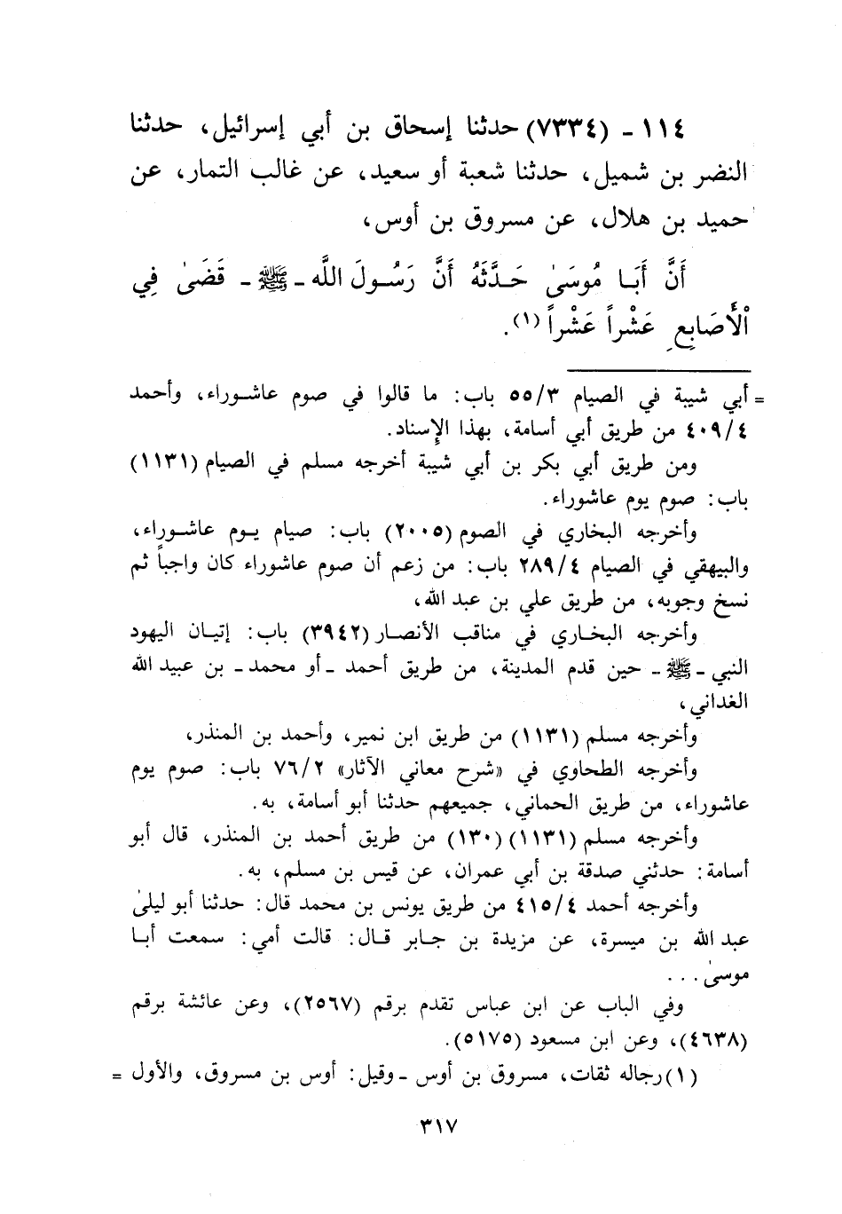 7334 - حَدَّثَنَا إِسْحَاقُ بْنُ أَبِي إِسْرَائِيلَ، حَدَّثَنَا النَّضْرُ بْنُ شُمَيْلٍ، حَدَّثَنَا شُعْبَةُ، أَوْ سَعِيدٌ، عَنْ غَالِبٍ التَّمَّارِ، عَنْ حُمَيْدِ بْنِ هِلَالٍ، عَنْ مَسْرُوقِ بْنِ أَوْسٍ، أَنَّ أَبَا مُوسَى حَدَّثَهُ، «أَنَّ رَسُولَ اللَّهِ صَلَّى اللهُ عَلَيْهِ وَسَلَّمَ §قَضَى فِي الْأَصَابِعِ عَشْرًا عَشْرًا» Kرجاله ثقات
