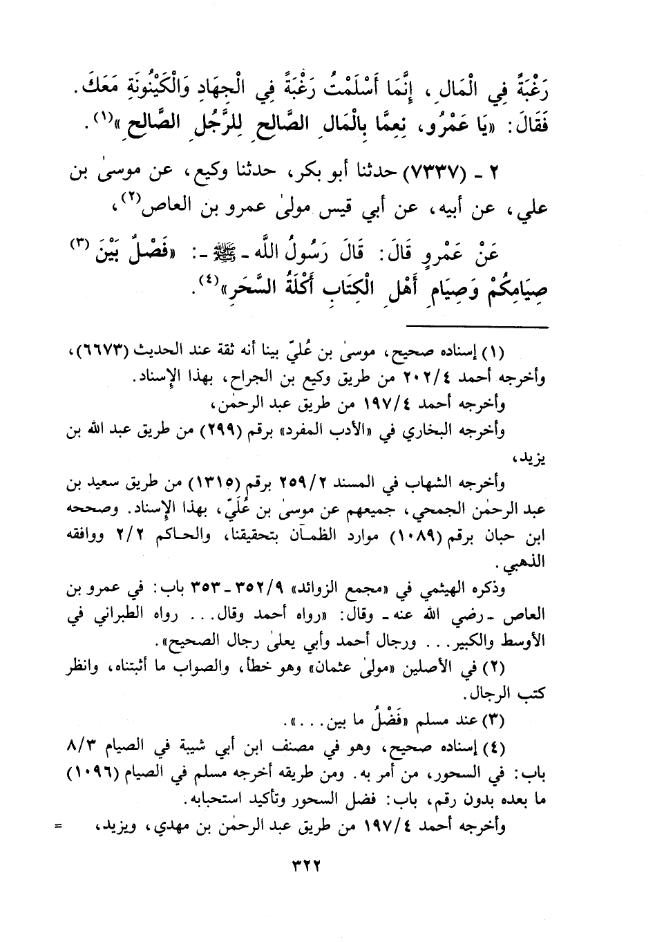 7337 - حَدَّثَنَا أَبُو بَكْرٍ، حَدَّثَنَا وَكِيعٌ، عَنْ مُوسَى بْنِ عَلِيٍّ، عَنْ أَبِيهِ، عَنْ أَبِي قَيْسٍ مَوْلَى عَمْرِو بْنِ الْعَاصِ، عَنْ عَمْرٍو قَالَ: قَالَ رَسُولُ اللَّهِ صَلَّى اللهُ عَلَيْهِ وَسَلَّمَ: «§فَصْلٌ بَيْنَ صِيَامِكُمْ وَصِيَامِ أَهْلِ الْكِتَابِ أَكْلَةُ السَّحَرِ» Kإسناده صحيح