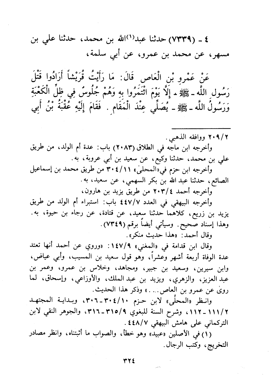 7339 - حَدَّثَنَا عَبْدُ اللَّهِ بْنُ مُحَمَّدٍ، حَدَّثَنَا عَلِيُّ بْنُ مُسْهِرٍ، عَنْ مُحَمَّدِ بْنِ عَمْرٍو، عَنْ أَبِي سَلَمَةَ، عَنْ عَمْرِو بْنِ الْعَاصِ قَالَ: مَا رَأَيْتُ قُرَيْشًا أَرَادُوا قَتْلَ رَسُولِ اللَّهِ صَلَّى اللهُ عَلَيْهِ وَسَلَّمَ إِلَّا يَوْمَ ائْتَمَرُوا بِهِ وَهُمْ جُلُوسٌ فِي ظِلِّ الْكَعْبَةِ وَرَسُولُ اللَّهِ صَلَّى اللهُ عَلَيْهِ وَسَلَّمَ يُصَلِّي عِنْدَ الْمَقَامِ، فَقَامَ إِلَيْهِ عُقْبَةُ بْنُ أَبِي -[325]- مُعَيْطٍ فَجَعَلَ رِدَاءَهُ فِي عُنُقِهِ، ثُمَّ جَذَبَهُ حَتَّى وَجَبَ لِرُكْبَتَيْهِ، وَتَصَايَحَ النَّاسُ، وَظَنُّوا أَنَّهُ مَقْتُولٌ، قَالَ: وَأَقْبَلَ أَبُو بَكْرٍ يَشْتَدُّ حَتَّى أَخَذَ بِضَبْعِ رَسُولِ اللَّهِ صَلَّى اللهُ عَلَيْهِ وَسَلَّمَ مِنْ وَرَائِهِ وَهُوَ يَقُولُ: أَيَقْتُلُونَ رَجُلًا أَنْ يَقُولَ رَبِّيَ اللَّهُ؟ ثُمَّ انْصَرَفُوا عَنِ النَّبِيِّ صَلَّى اللهُ عَلَيْهِ وَسَلَّمَ، فَقَامَ رَسُولُ اللَّهِ صَلَّى اللهُ عَلَيْهِ وَسَلَّمَ، فَلَمَّا قَضَى صَلَاتَهُ مَرَّ بِهِمْ وَهُمْ جُلُوسٌ فِي ظِلِّ الْكَعْبَةِ فَقَالَ: «§يَا مَعْشَرَ قُرَيْشٍ، أَمَا وَالَّذِي نَفْسِي بِيَدِهِ مَا أُرْسِلْتُ إِلَيْكُمْ إِلَّا بِالذَّبْحِ»، وَأَشَارَ بِيَدِهِ إِلَى حَلْقِهِ، قَالَ لَهُ أَبُو جَهْلٍ: يَا مُحَمَّدُ، مَا كُنْتَ جَهُولًا، فَقَالَ رَسُولُ اللَّهِ صَلَّى اللهُ عَلَيْهِ وَسَلَّمَ: «أَنْتَ مِنْهُمْ» Kإسناده حسن