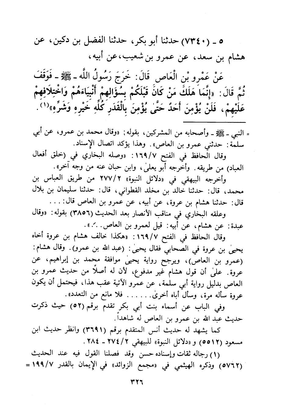 7340 - حَدَّثَنَا أَبُو بَكْرٍ، حَدَّثَنَا الْفَضْلُ بْنُ دُكَيْنٍ، عَنْ هِشَامِ بْنِ سَعْدٍ، عَنْ عَمْرِو بْنِ شُعَيْبٍ، عَنْ أَبِيهِ، عَنْ عَمْرِو بْنِ الْعَاصِ قَالَ: خَرَجَ رَسُولُ اللَّهِ صَلَّى اللهُ عَلَيْهِ وَسَلَّمَ فَوَقَفَ، ثُمَّ قَالَ: «إِنَّمَا §هَلَكَ مَنْ كَانَ قَبْلَكُمْ بِسُؤَالِهِمْ أَنْبِيَاءَهُمْ، وَاخْتِلَافِهِمْ عَلَيْهِمْ، فَلَنْ يُؤْمِنَ أَحَدٌ حَتَّى يُؤْمِنَ بِالْقَدَرِ كُلِّهِ خَيْرِهِ وَشَرِّهِ» Kرجاله ثقات وإسناده حسن