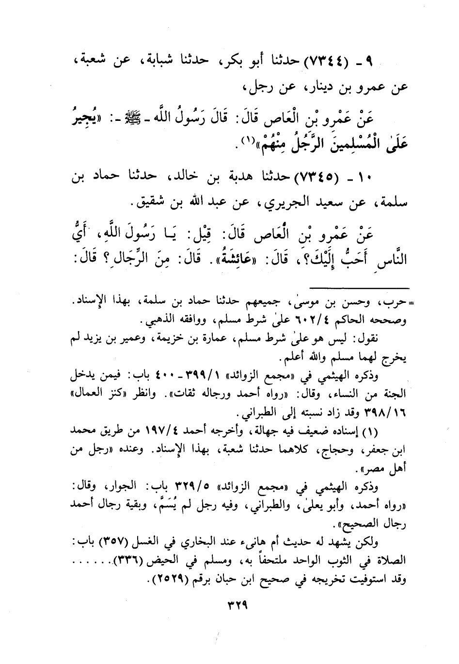 7345 - حَدَّثَنَا هُدْبَةُ بْنُ خَالِدٍ، حَدَّثَنَا حَمَّادُ بْنُ سَلَمَةَ، عَنْ سَعِيدٍ الْجُرَيْرِيِّ، عَنْ عَبْدِ اللَّهِ بْنِ شَقِيقٍ، عَنْ عَمْرِو بْنِ الْعَاصِ قَالَ: قِيلَ: يَا رَسُولَ اللَّهِ، §أَيُّ النَّاسِ أَحَبُّ إِلَيْكَ؟ قَالَ: «عَائِشَةُ»، قَالَ: مِنَ الرِّجَالِ؟ قَالَ: «أَبُو بَكْرٍ»، قَالَ: ثُمَّ مَنْ؟ قَالَ: «ثُمَّ أَبُو عُبَيْدَةَ بْنُ الْجَرَّاحِ» Kإسناده صحيح