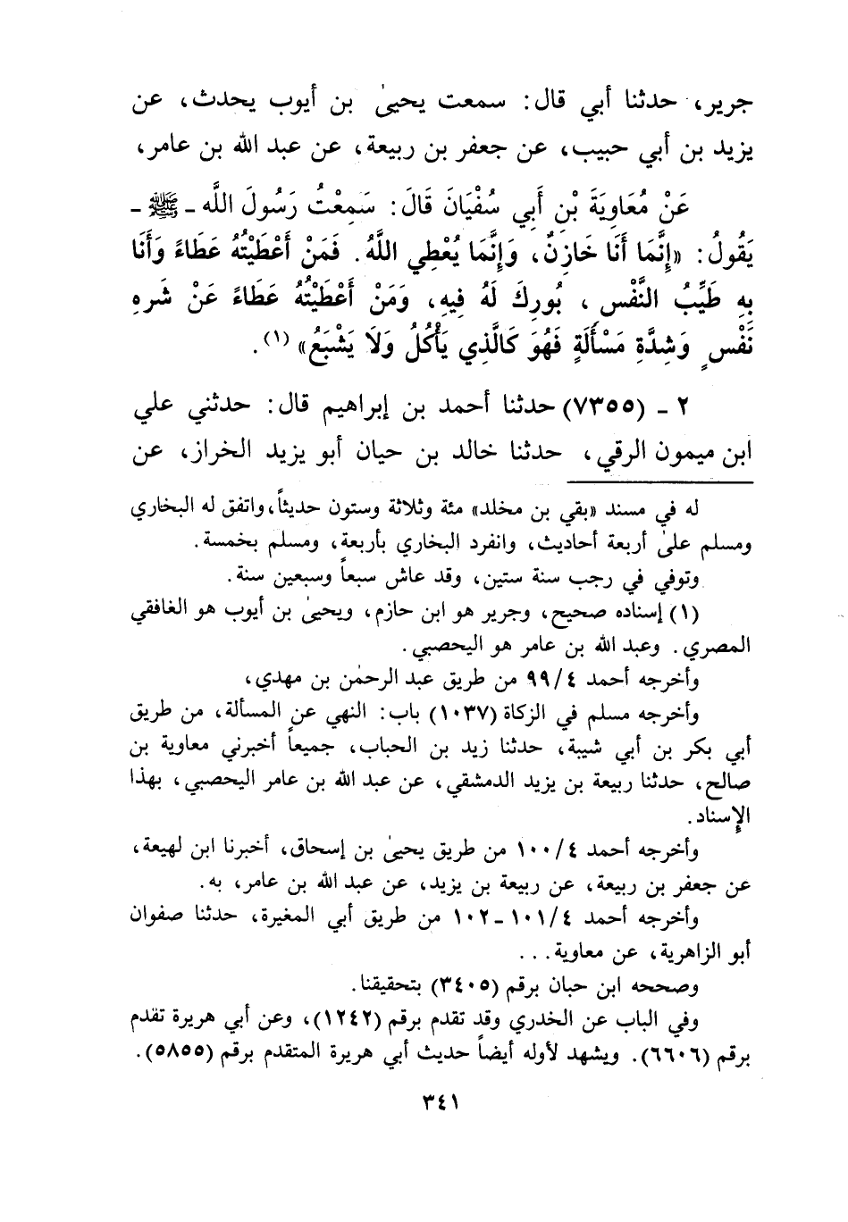7355 - حَدَّثَنَا أَحْمَدُ بْنُ إِبْرَاهِيمَ، قَالَ: حَدَّثَنِي عَلِيُّ بْنُ مَيْمُونٍ الرَّقِّيُّ، حَدَّثَنَا خَالِدُ بْنُ حَيَّانَ أَبُو يَزِيدَ الْخَرَّازُ، عَنْ سُلَيْمَانَ بْنِ عَبْدِ اللَّهِ بْنِ الزِّبْرِقَانِ، عَنْ يَعْلَى بْنِ أَوْسٍ قَالَ: سَمِعْتُ مُعَاوِيَةَ يَقُولُ: سَمِعْتُ رَسُولَ اللَّهِ صَلَّى اللهُ عَلَيْهِ وَسَلَّمَ يَقُولُ: «§كُلُّ مُسْكِرٍ عَلَى كُلِّ مُؤْمِنٍ حَرَامٌ» Kإسناده جيد