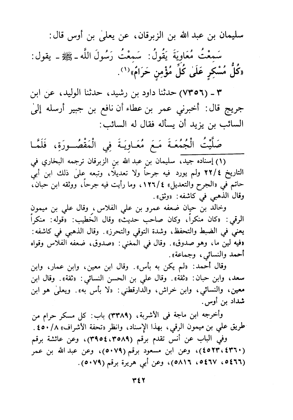 7356 - حَدَّثَنَا دَاوُدُ بْنُ رُشَيْدٍ، حَدَّثَنَا الْوَلِيدُ، عَنِ ابْنِ جُرَيْجٍ قَالَ: أَخْبَرَنِي عُمَرُ بْنُ عَطَاءٍ، أَنَّ نَافِعَ بْنَ جُبَيْرٍ أَرْسَلَهُ إِلَى السَّائِبِ بْنِ يَزِيدَ أَنْ يَسْأَلَهُ، فَقَالَ لَهُ السَّائِبُ: صَلَّيْتُ الْجُمُعَةَ مَعَ مُعَاوِيَةَ فِي الْمَقْصُورَةِ فَلَمَّا سَلَّمْتُ قُمْتُ أُصَلِّي , فَقَالَ لِي: «§إِذَا صَلَّيْتَ الْجُمُعَةَ فَلَا تَصِلْهَا بِصَلَاةٍ إِلَّا أَنْ تَكَلَّمَ أَوْ تَخْرُجَ، فَإِنَّ رَسُولَ اللَّهِ صَلَّى اللهُ عَلَيْهِ وَسَلَّمَ أَمَرَ بِذَلِكَ» Kإسناده صحيح