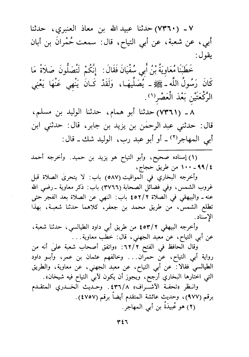 7360 - حَدَّثَنَا عُبَيْدُ اللَّهِ بْنُ مُعَاذٍ الْعَنْبَرِيُّ، حَدَّثَنَا أَبِي، عَنْ شُعْبَةَ، عَنْ أَبِي التَّيَّاحِ قَالَ: سَمِعْتُ حُمْرَانَ بْنَ أَبَانَ يَقُولُ: خَطَبَنَا مُعَاوِيَةُ بْنُ أَبِي سُفْيَانَ فَقَالَ: «§إِنَّكُمْ لَتُصَلُّونَ صَلَاةً مَا كَانَ رَسُولُ اللَّهِ صَلَّى اللهُ عَلَيْهِ وَسَلَّمَ يُصَلِّيهَا، وَلَقَدْ كَانَ يَنْهَى عَنْهَا»، يَعْنِي: الرَّكْعَتَيْنِ بَعْدَ الْعَصْرِKإسناده صحيح