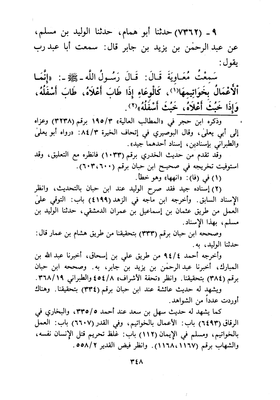 7362 - حَدَّثَنَا أَبُو هَمَّامٍ، حَدَّثَنَا الْوَلِيدُ بْنُ مُسْلِمٍ، عَنْ عَبْدِ الرَّحْمَنِ بْنِ يَزِيدَ بْنِ جَابِرٍ قَالَ: سَمِعْتُ أَبَا عَبْدِ رَبٍّ يَقُولُ: سَمِعْتُ مُعَاوِيَةَ قَالَ: قَالَ رَسُولُ اللَّهِ صَلَّى اللهُ عَلَيْهِ وَسَلَّمَ: «§إِنَّمَا الْأَعْمَالُ بِخَوَاتِيمِهَا، كَالْوِعَاءِ إِذَا طَابَ أَعْلَاهُ طَابَ أَسْفَلُهُ، وَإِذَا خَبُثَ أَعْلَاهُ خَبُثَ أَسْفَلُهُ» Kإسناده جيد