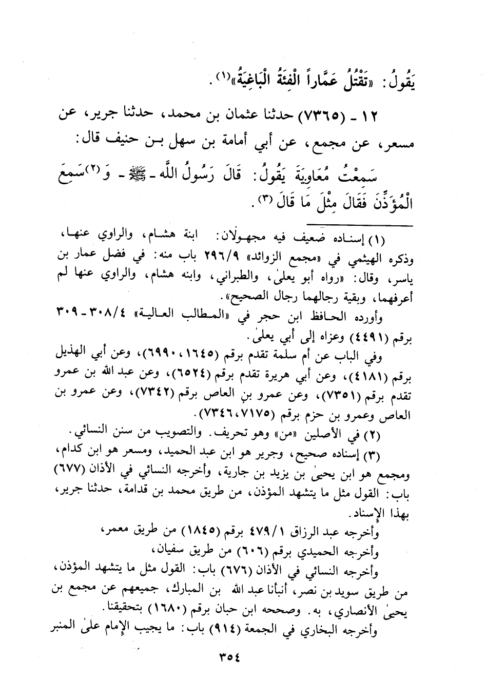 7365 - حَدَّثَنَا عُثْمَانُ بْنُ مُحَمَّدٍ، حَدَّثَنَا جَرِيرٌ، عَنْ مِسْعَرٍ، عَنْ مُجَمِّعٍ، عَنْ أَبِي أُمَامَةَ بْنِ سَهْلِ بْنِ حُنَيْفٍ قَالَ: سَمِعْتُ مُعَاوِيَةَ يَقُولُ: «§قَالَ رَسُولُ اللَّهِ صَلَّى اللهُ عَلَيْهِ وَسَلَّمَ وَسَمِعَ الْمُؤَذِّنَ، فَقَالَ مِثْلَ مَا قَالَ» Kإسناده صحيح
